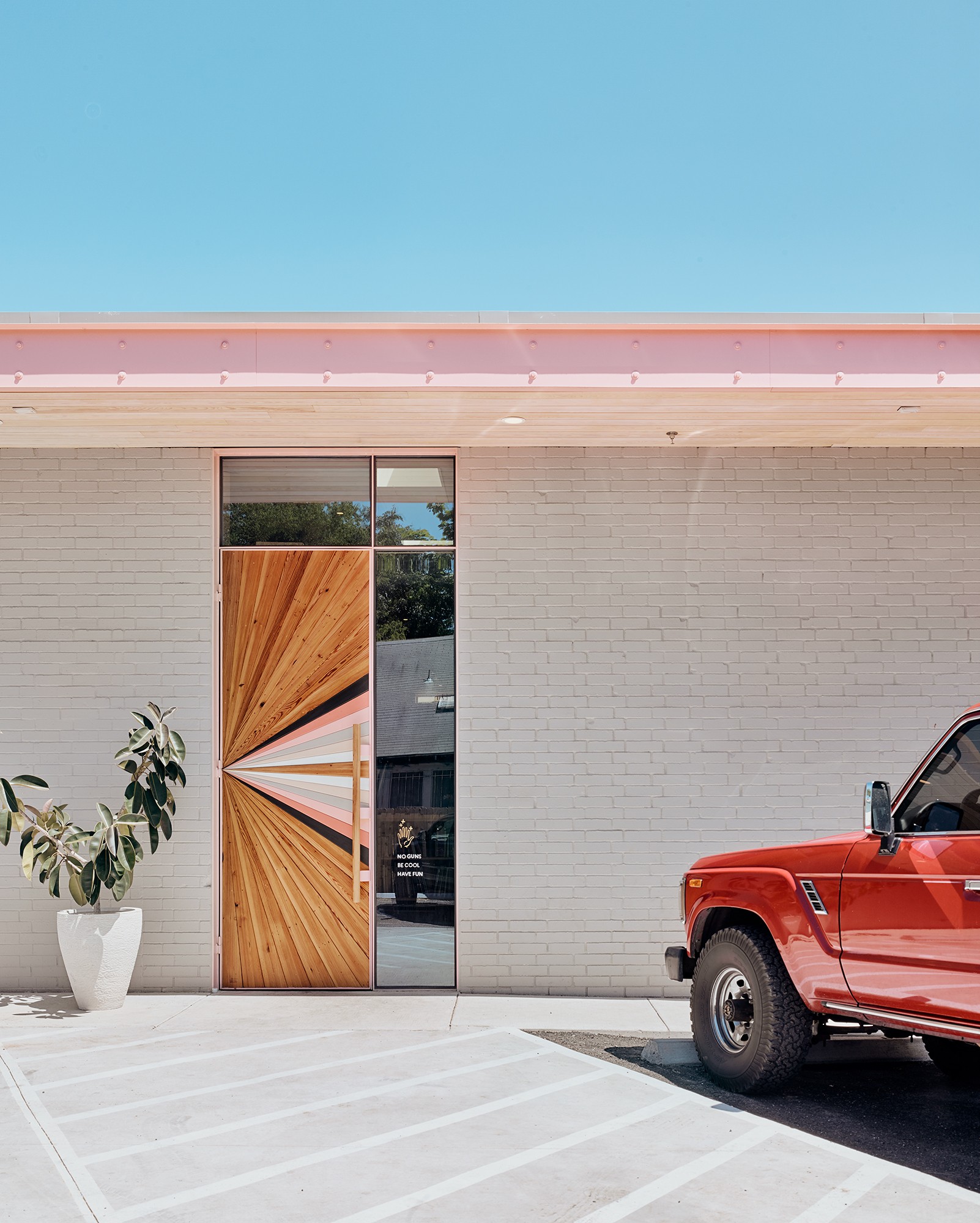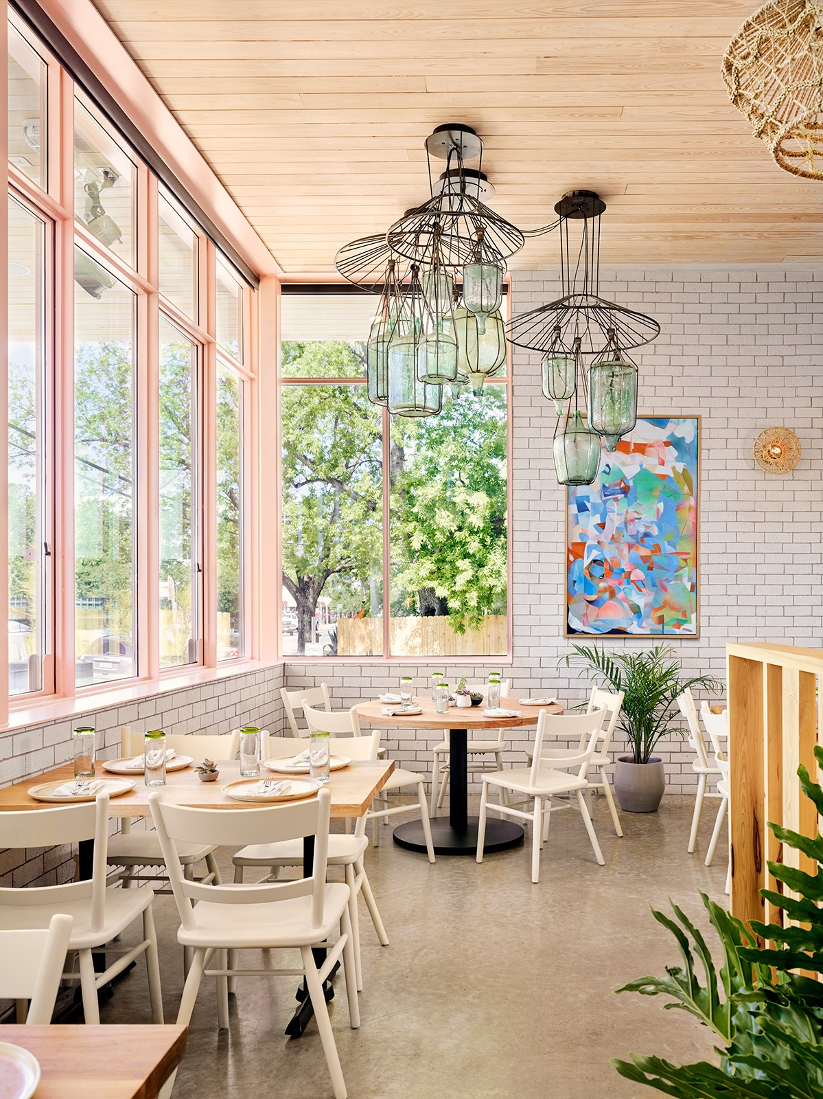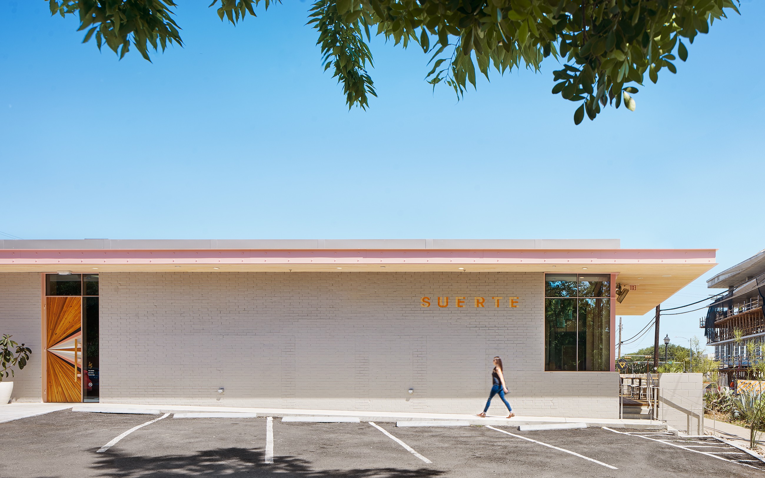 MGD’s first hospitality project in East Austin is all about connecting the energy of the kitchen to guests in open dining room and out onto east sixth street. The existing CMU building had low ceilings and narrow openings. As part of the remodel, the roof structure was raised and large custom steel windows inserted to open the dining space to the street. The exposed steel fascia and windows are painted a shade of pink, “shrimp salad” softening the typically cold material. Mexican influences throughout the interior compliment the food and complete the guest experience. Suerte is a Michelin Guide listed restaurant.