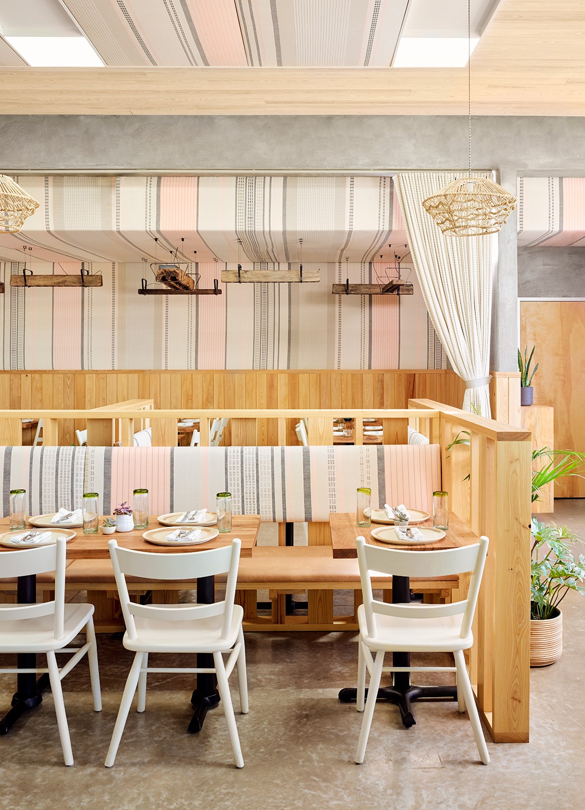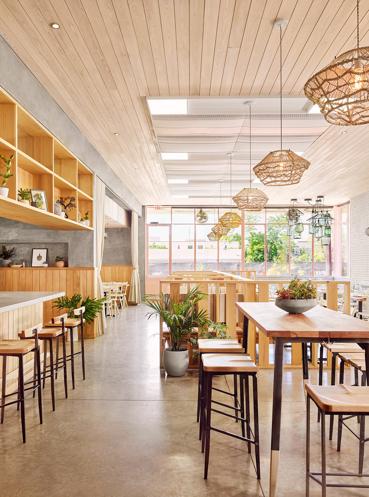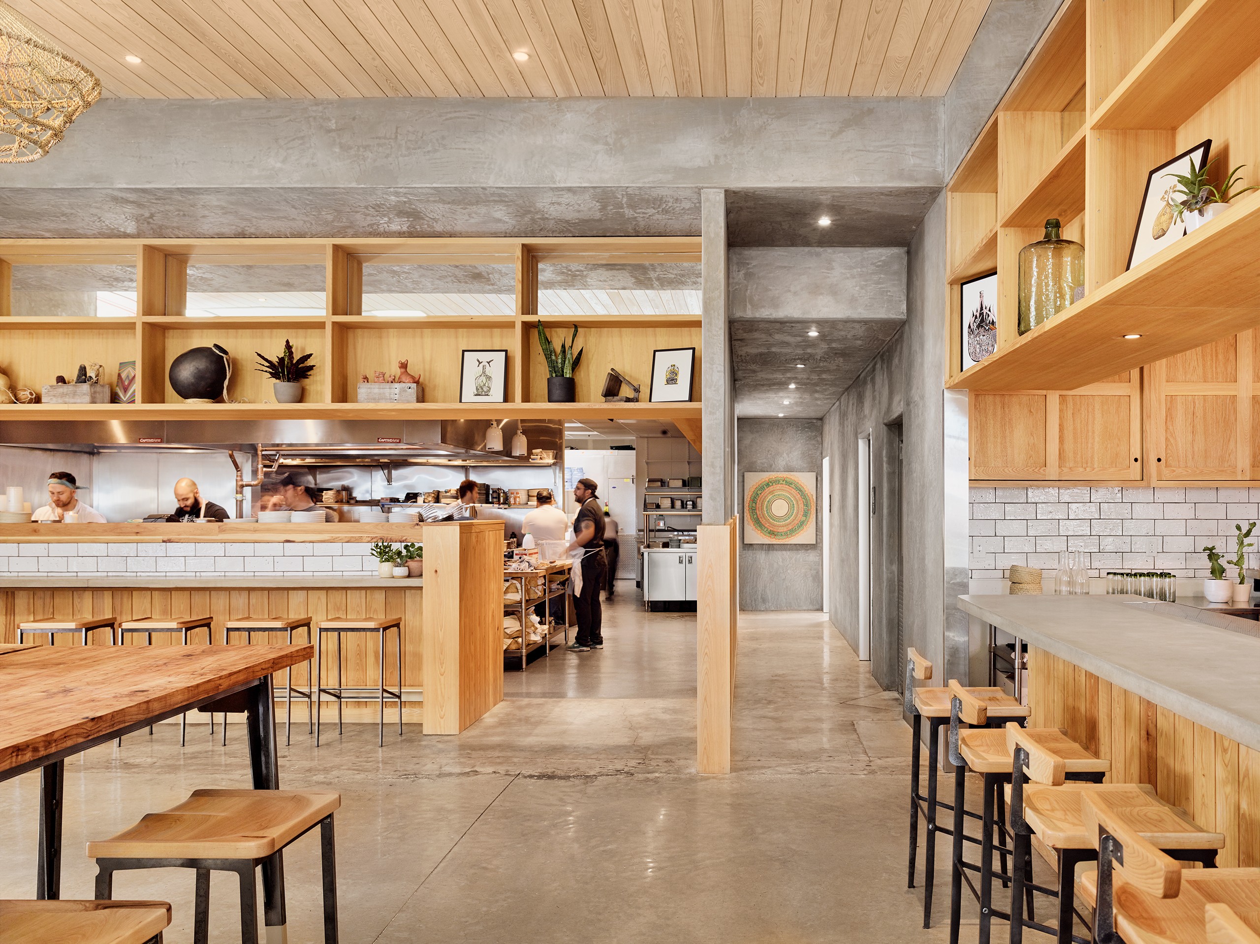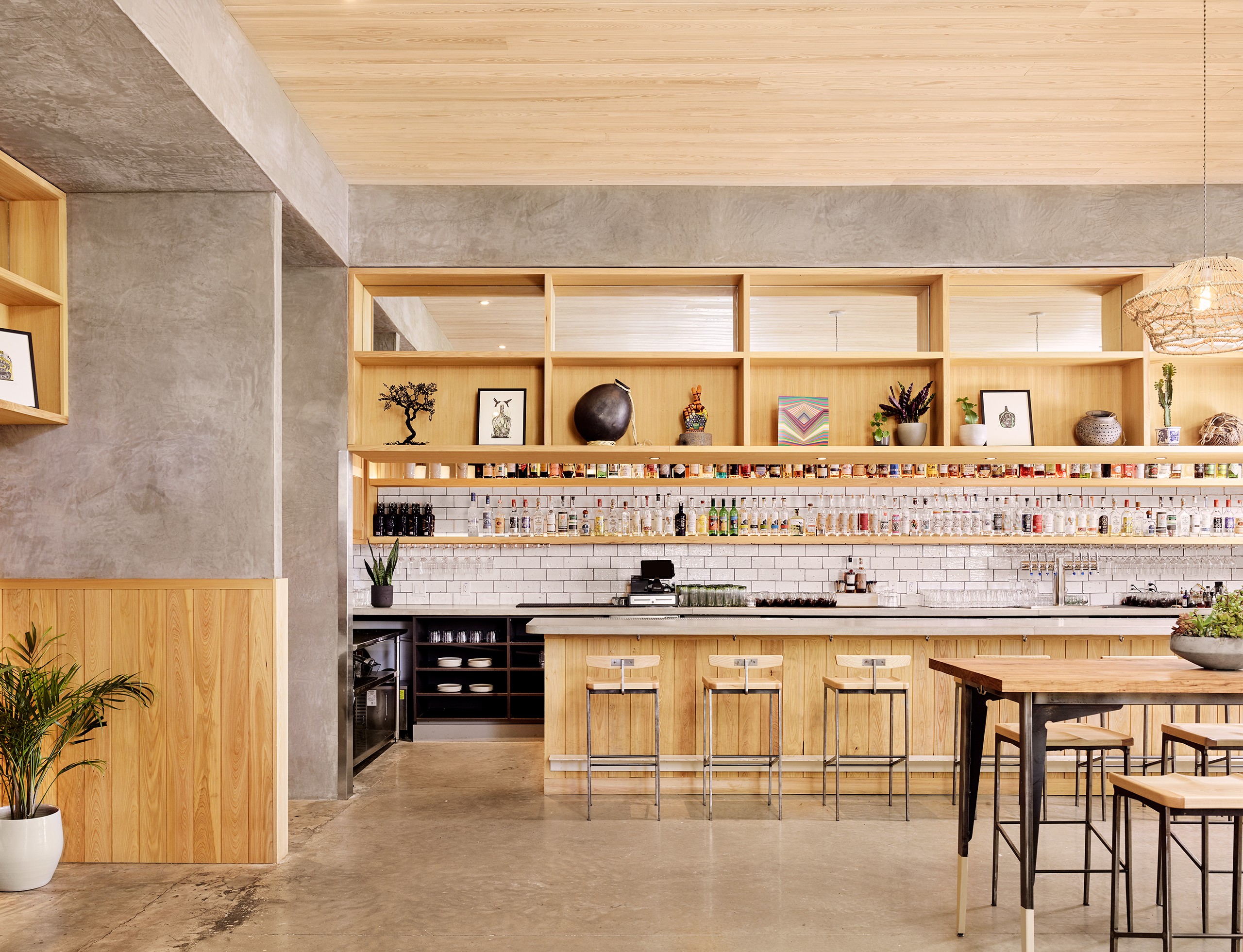 MGD’s first hospitality project in East Austin is all about connecting the energy of the kitchen to guests in open dining room and out onto east sixth street. The existing CMU building had low ceilings and narrow openings. As part of the remodel, the roof structure was raised and large custom steel windows inserted to open the dining space to the street. The exposed steel fascia and windows are painted a shade of pink, “shrimp salad” softening the typically cold material. Mexican influences throughout the interior compliment the food and complete the guest experience. Suerte is a Michelin Guide listed restaurant.