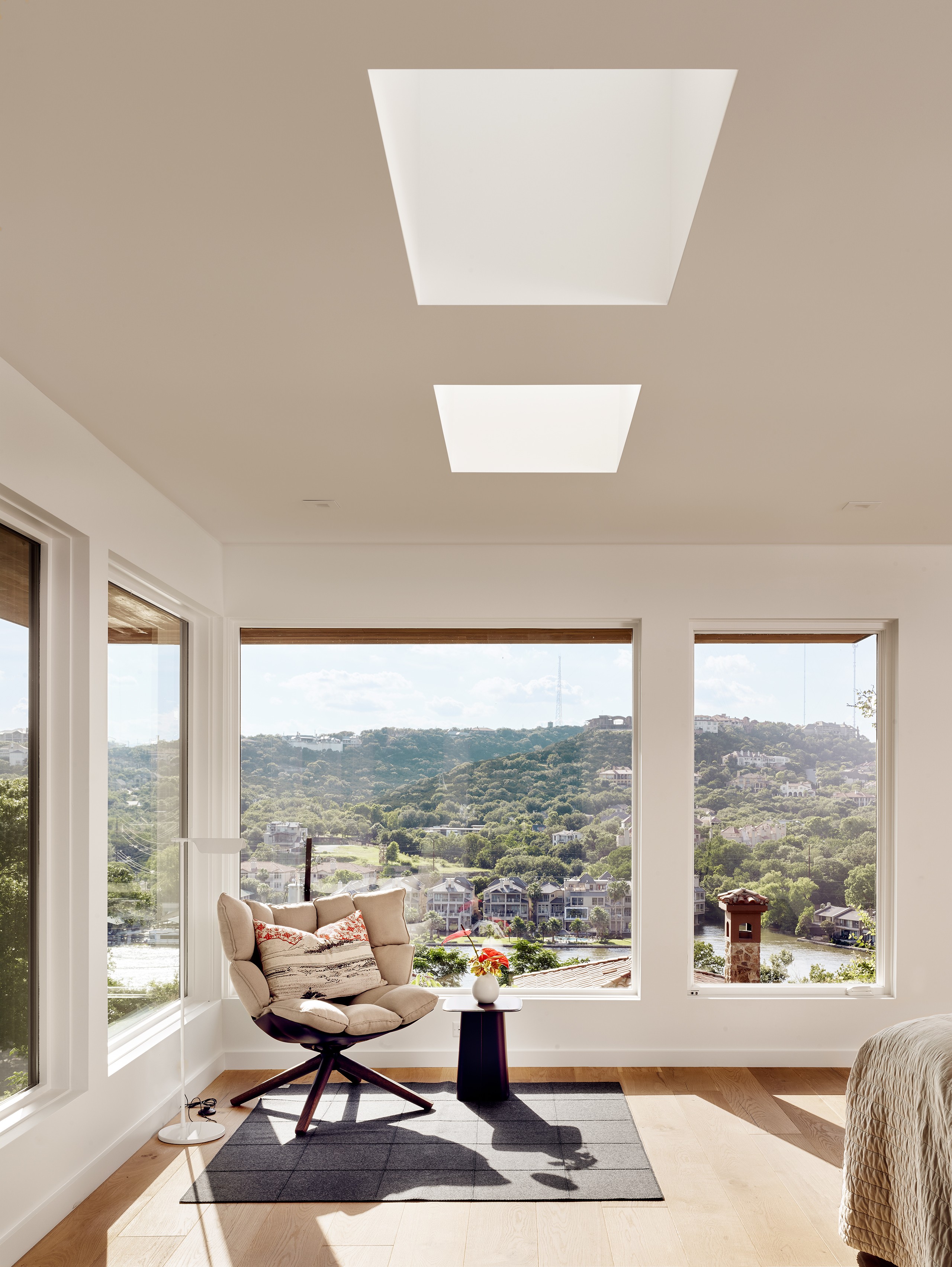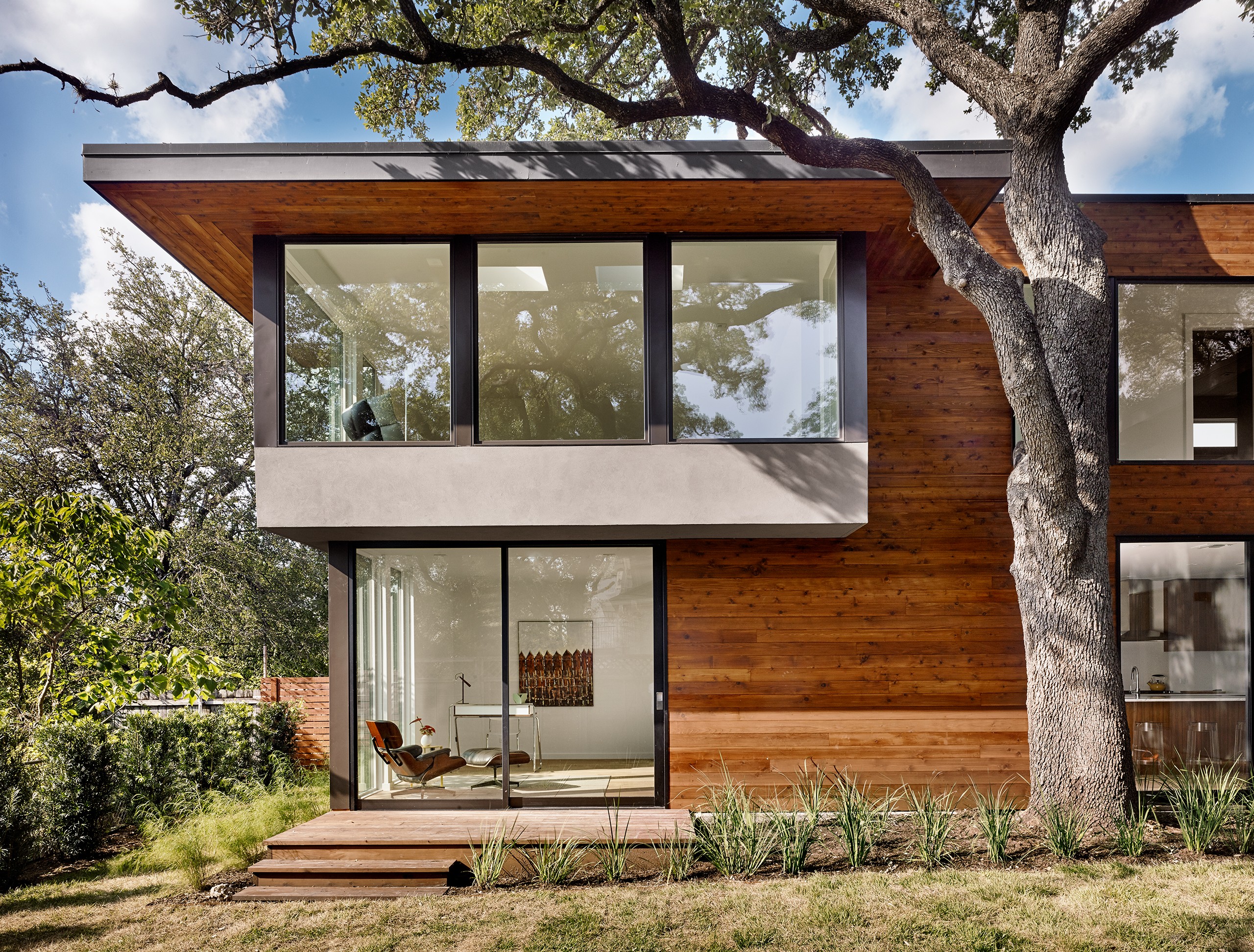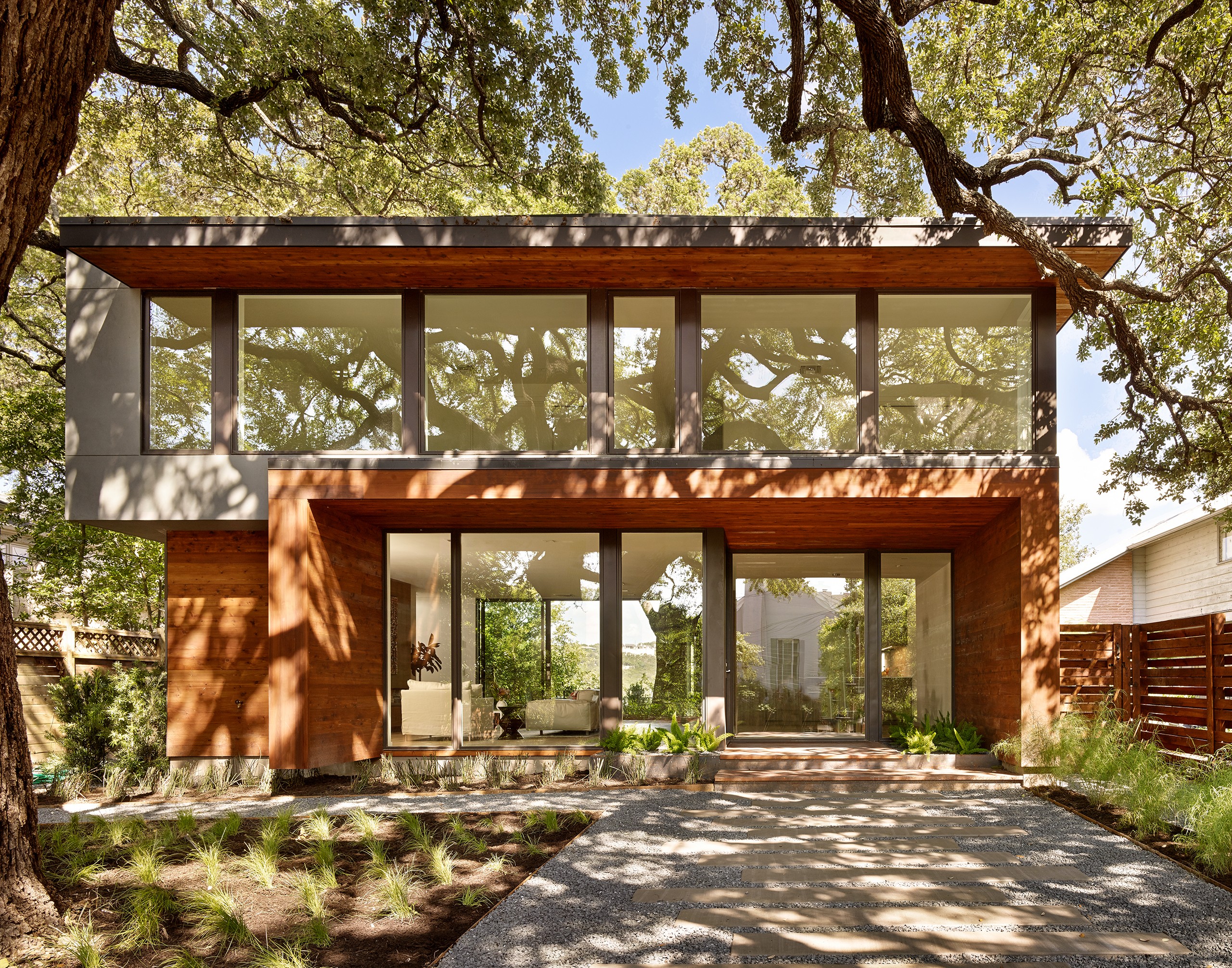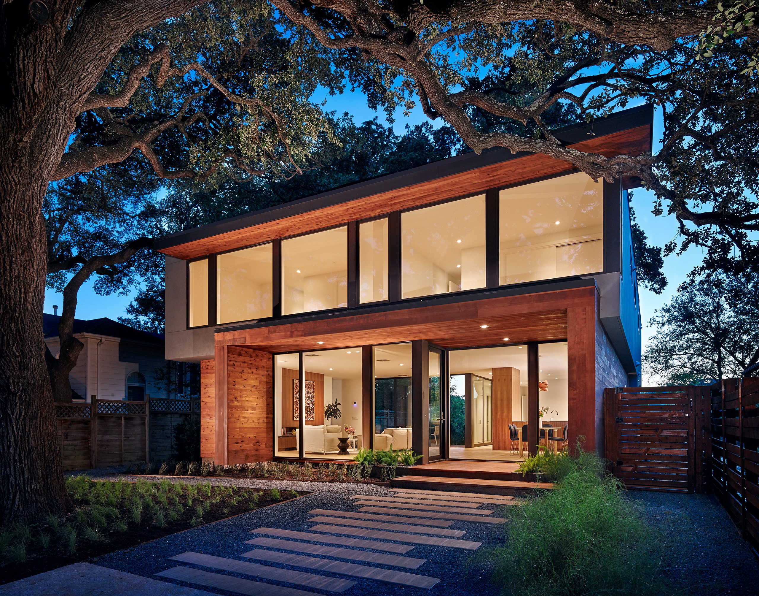This Tarrytown residence is designed around five protected heritage oak trees on a very small lot. The reverse engineering of the plan led to a design that perfectly highlights each tree individually. The building sits within the canopy and feels protected from the intense Texas sun. Large expansive windows provide a tree house like setting providing views to Lake Austin and the Westlake Hills beyond.