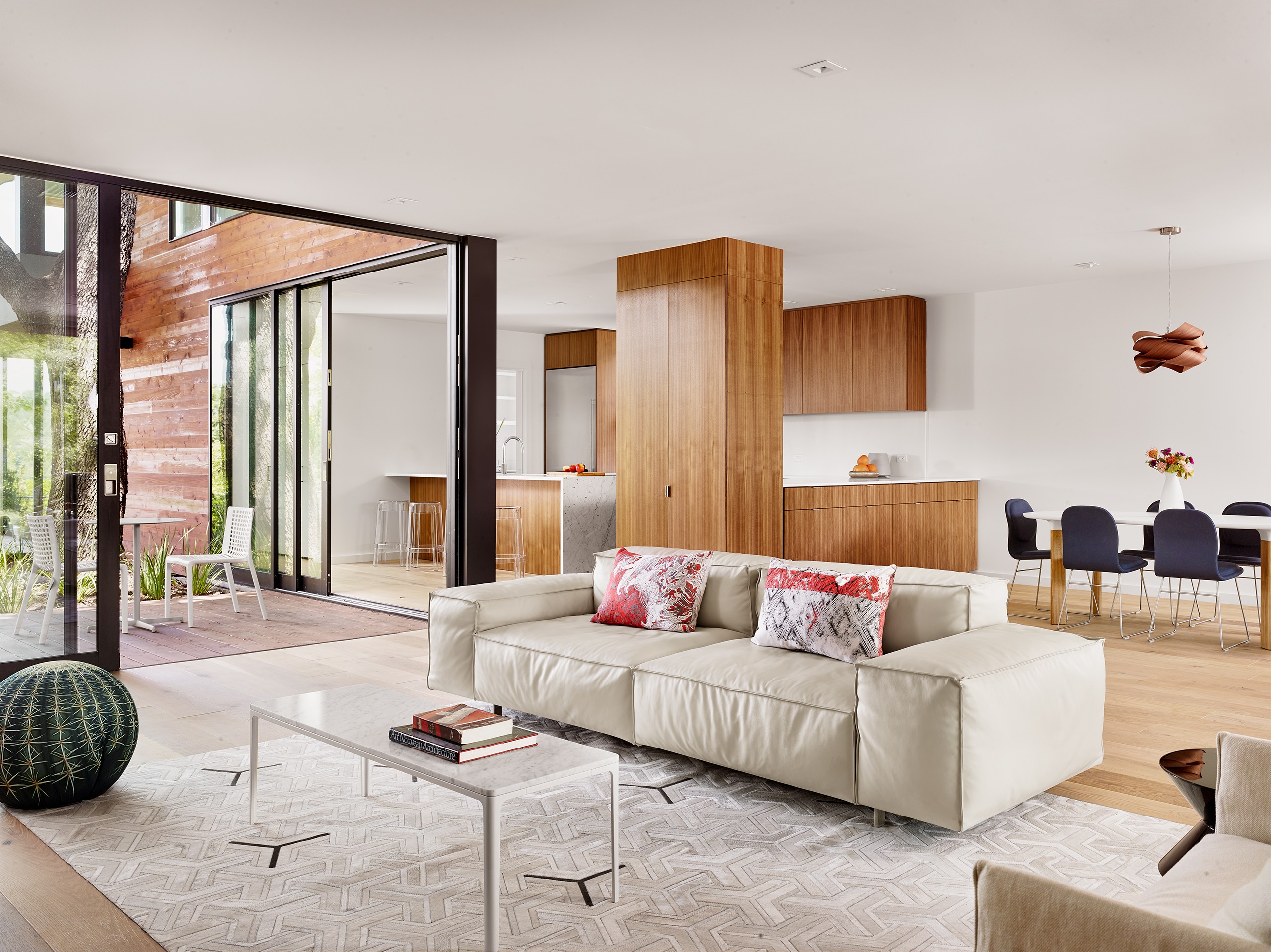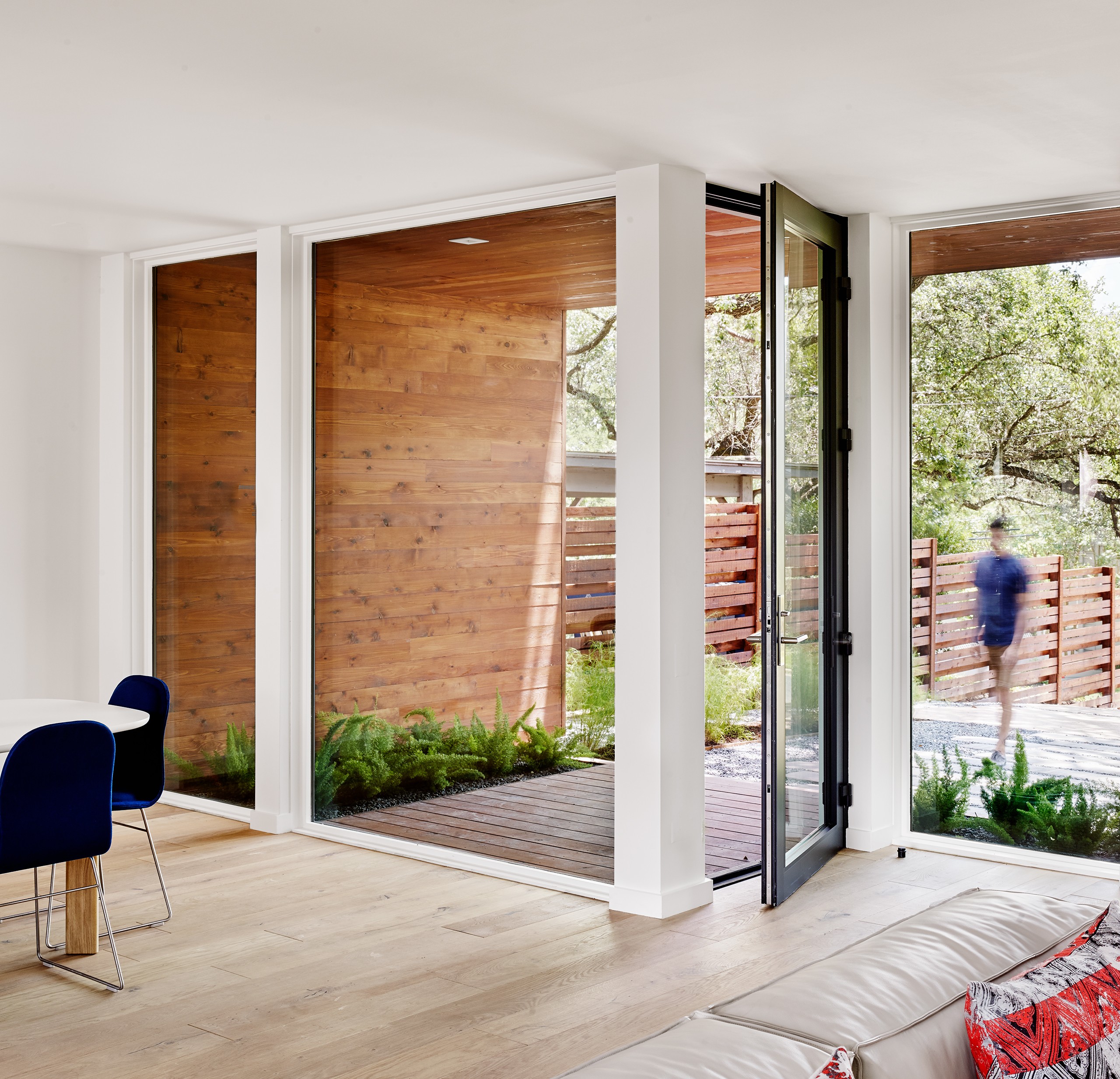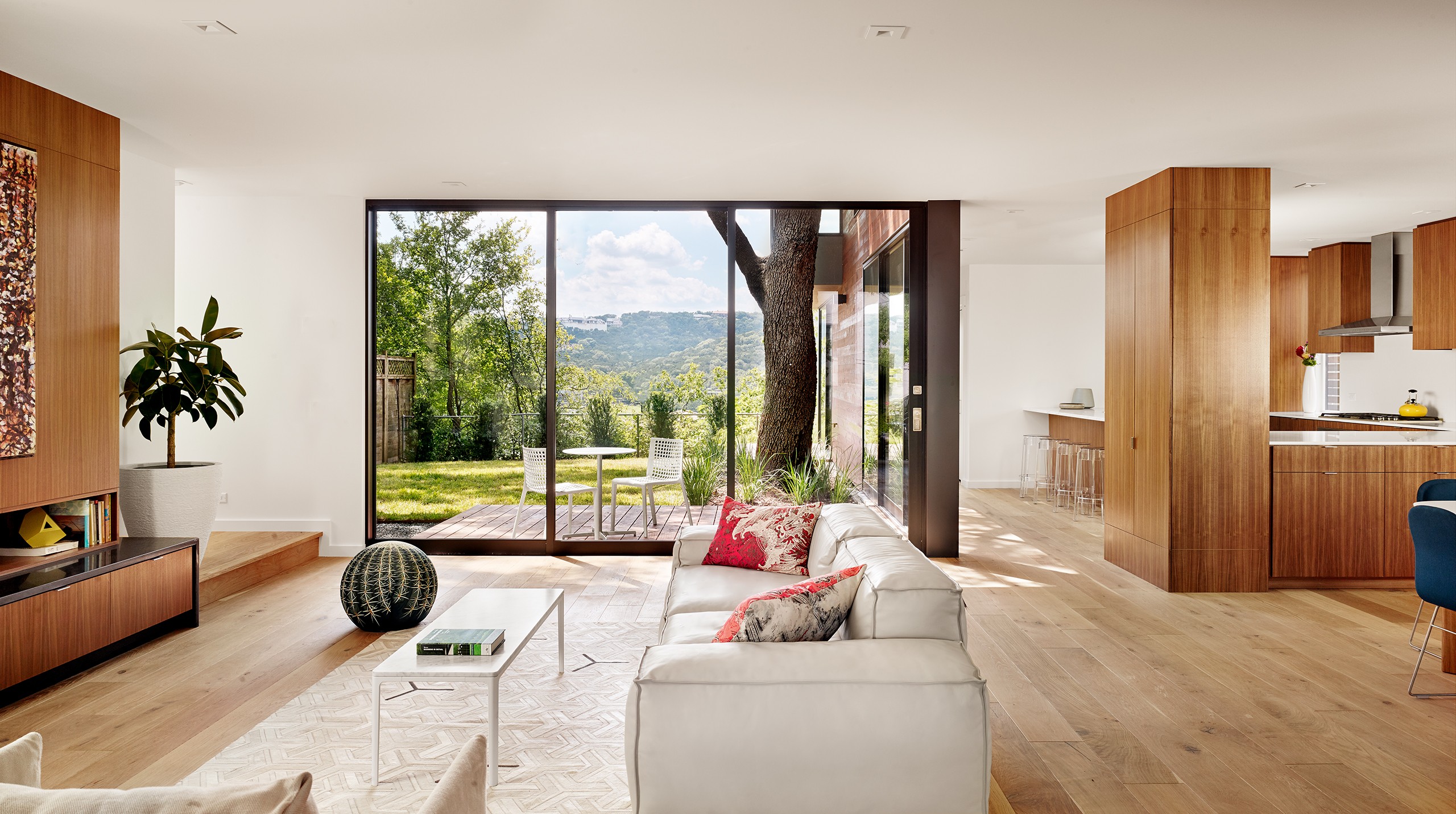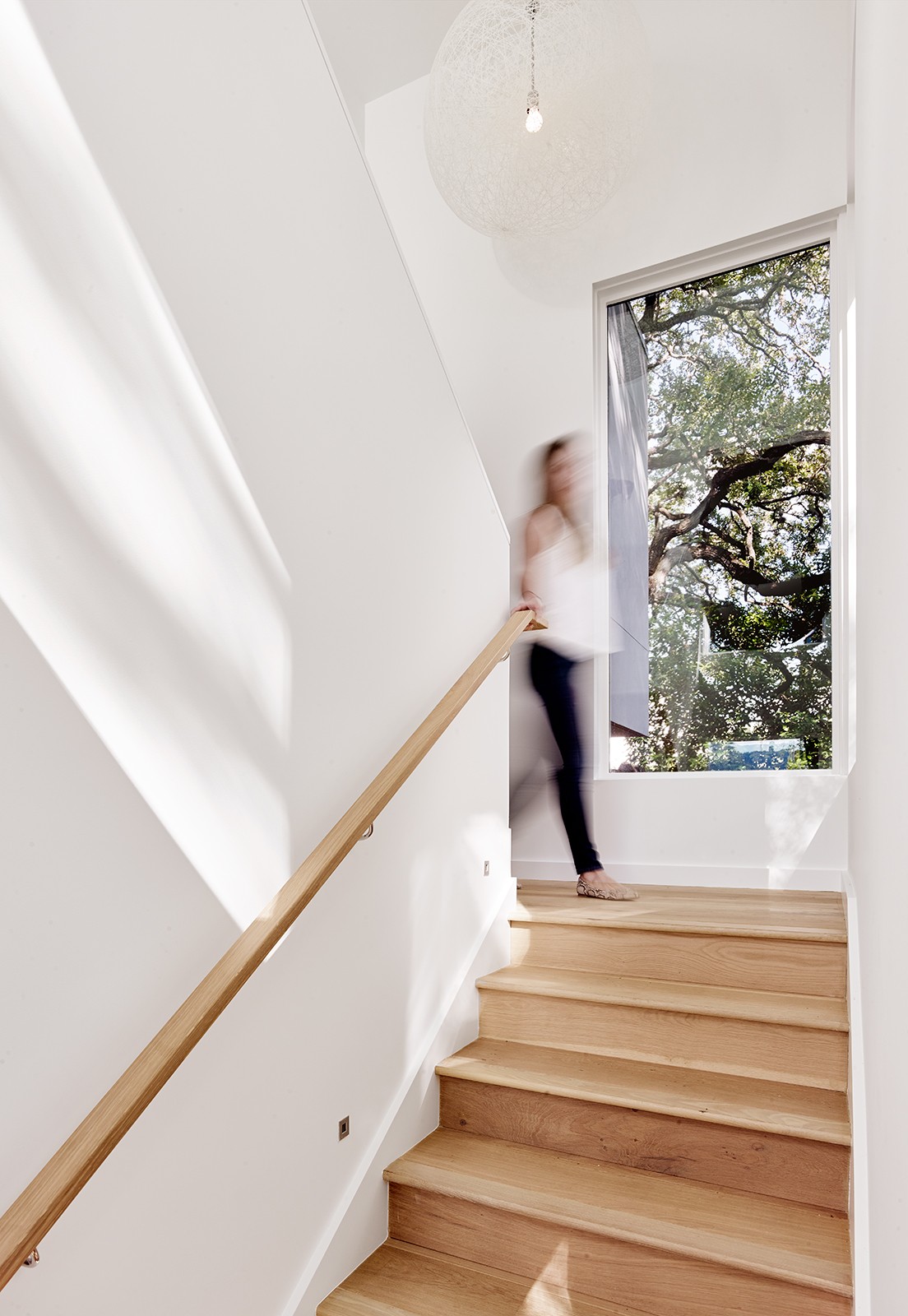 This Tarrytown residence is designed around five protected heritage oak trees on a very small lot. The reverse engineering of the plan led to a design that perfectly highlights each tree individually. The building sits within the canopy and feels protected from the intense Texas sun. Large expansive windows provide a tree house like setting providing views to Lake Austin and the Westlake Hills beyond.