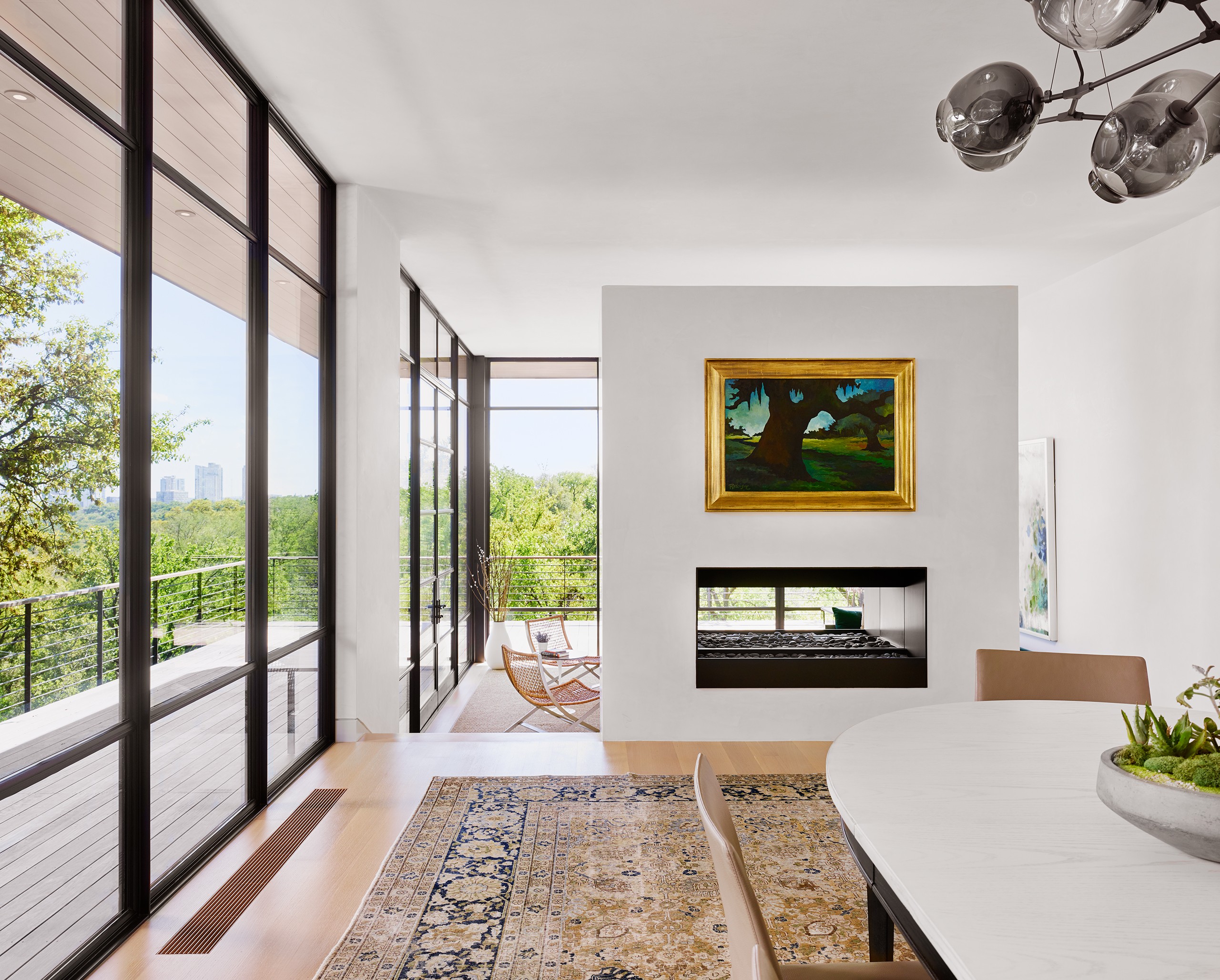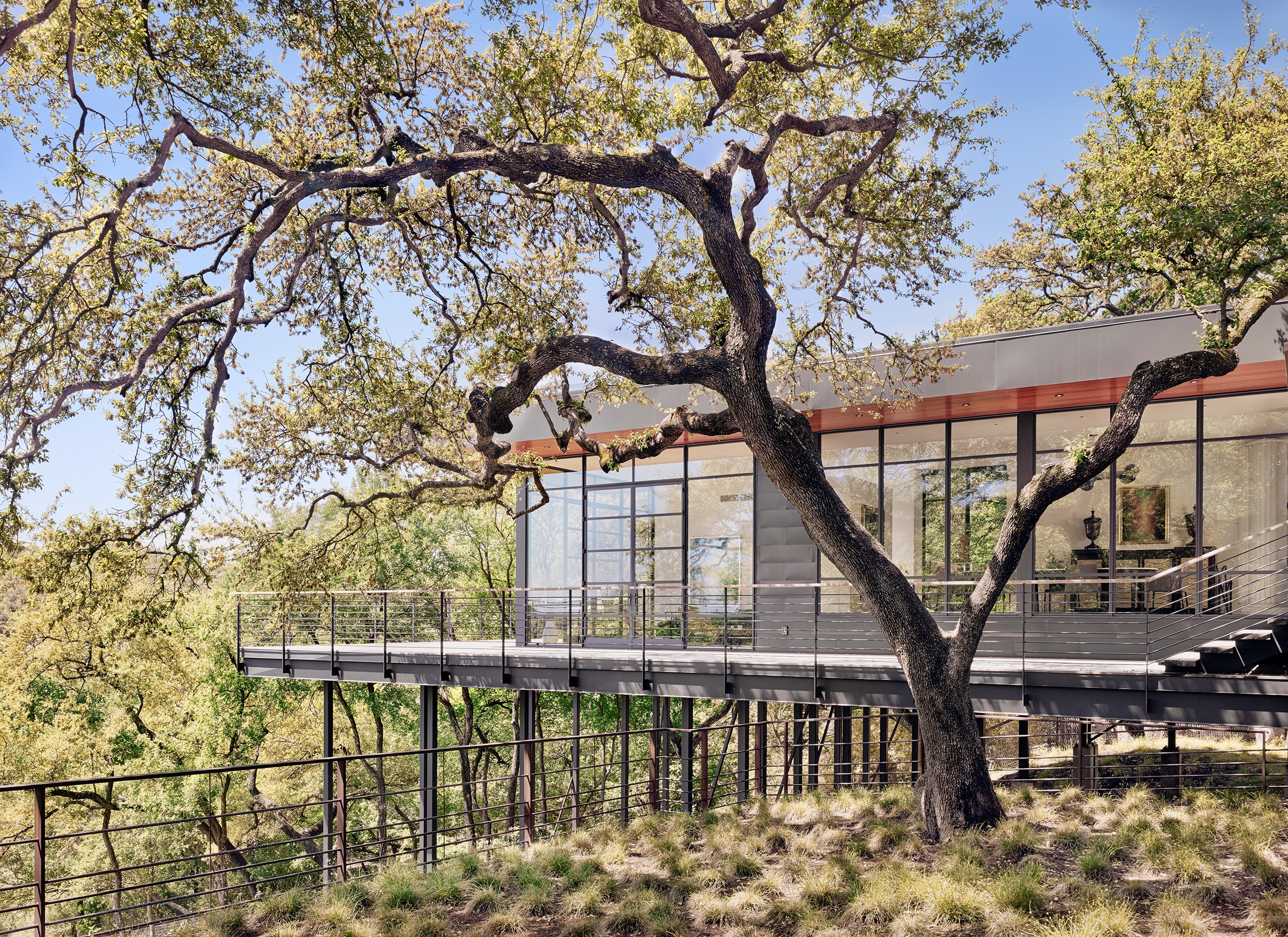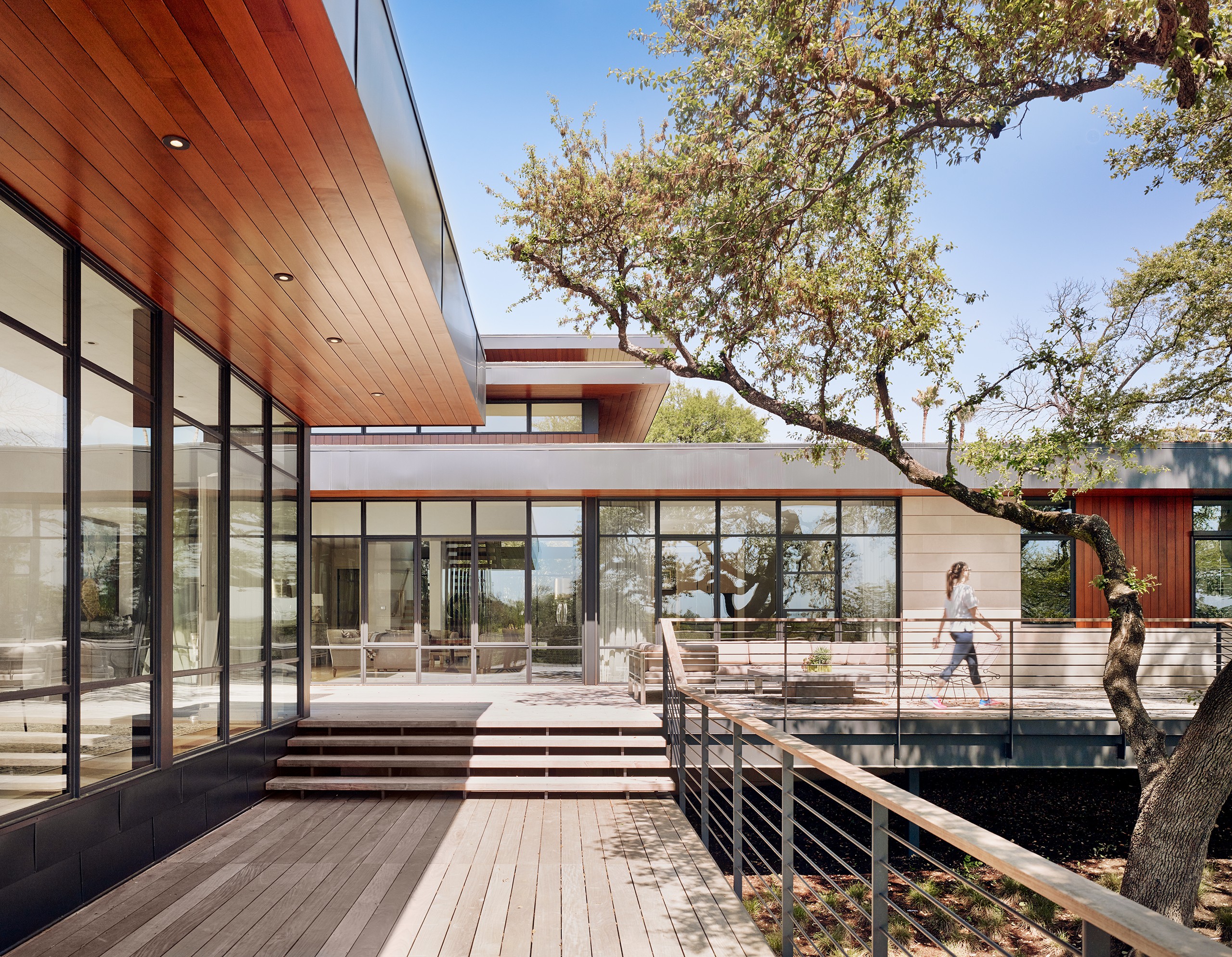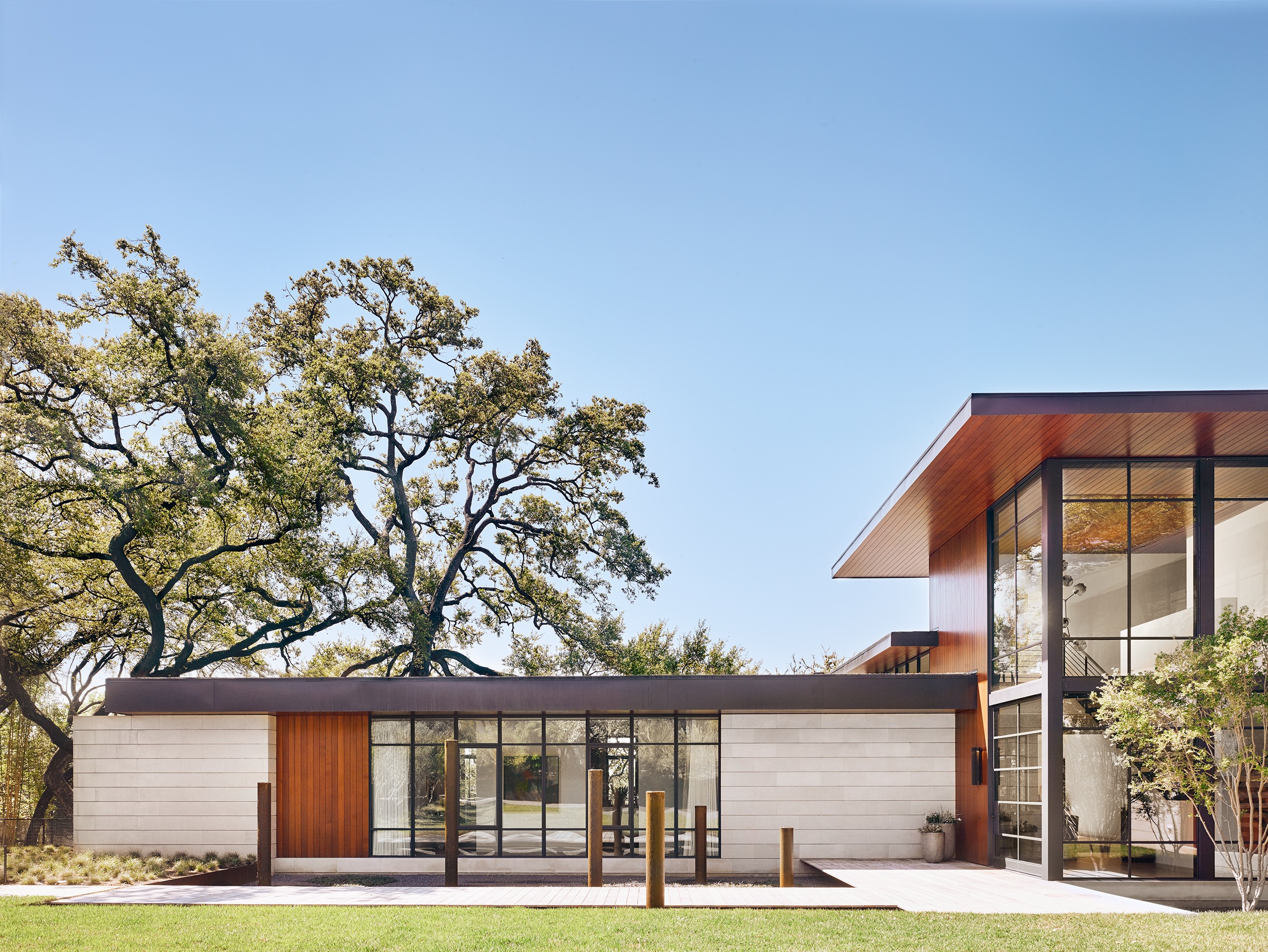 A significant commission early in MGD’s beginnings, the Pemberton Place residence showcases the highest standards in design and construction quality. The realizations of “what is possible” were made apparent on this project, working with the highest quality building artisans. Large heritage trees are highlighted, serving as natural anchors to the building and expansive exterior decks. Limestone is meticulously detailed and lives in perfect alignment with openings and material transitions. Wood siding provides warm accents and continuous wood ceilings run inside and out. Custom steel windows delicately frame expansive views of the site and downtown Austin beyond. Public spaces set up for grand entertaining while maintaining an intimate feel by use of warm materials and connections to the outside.