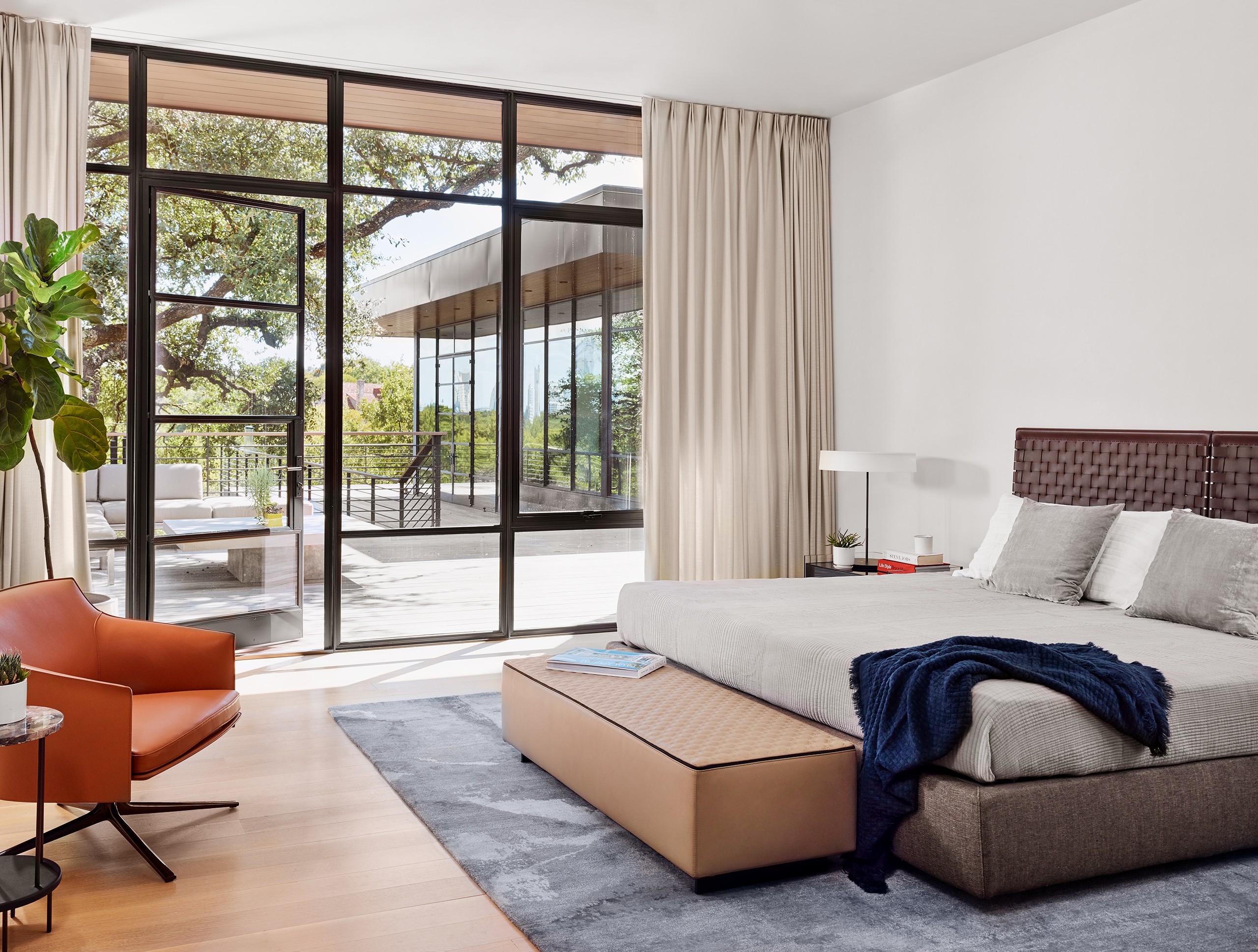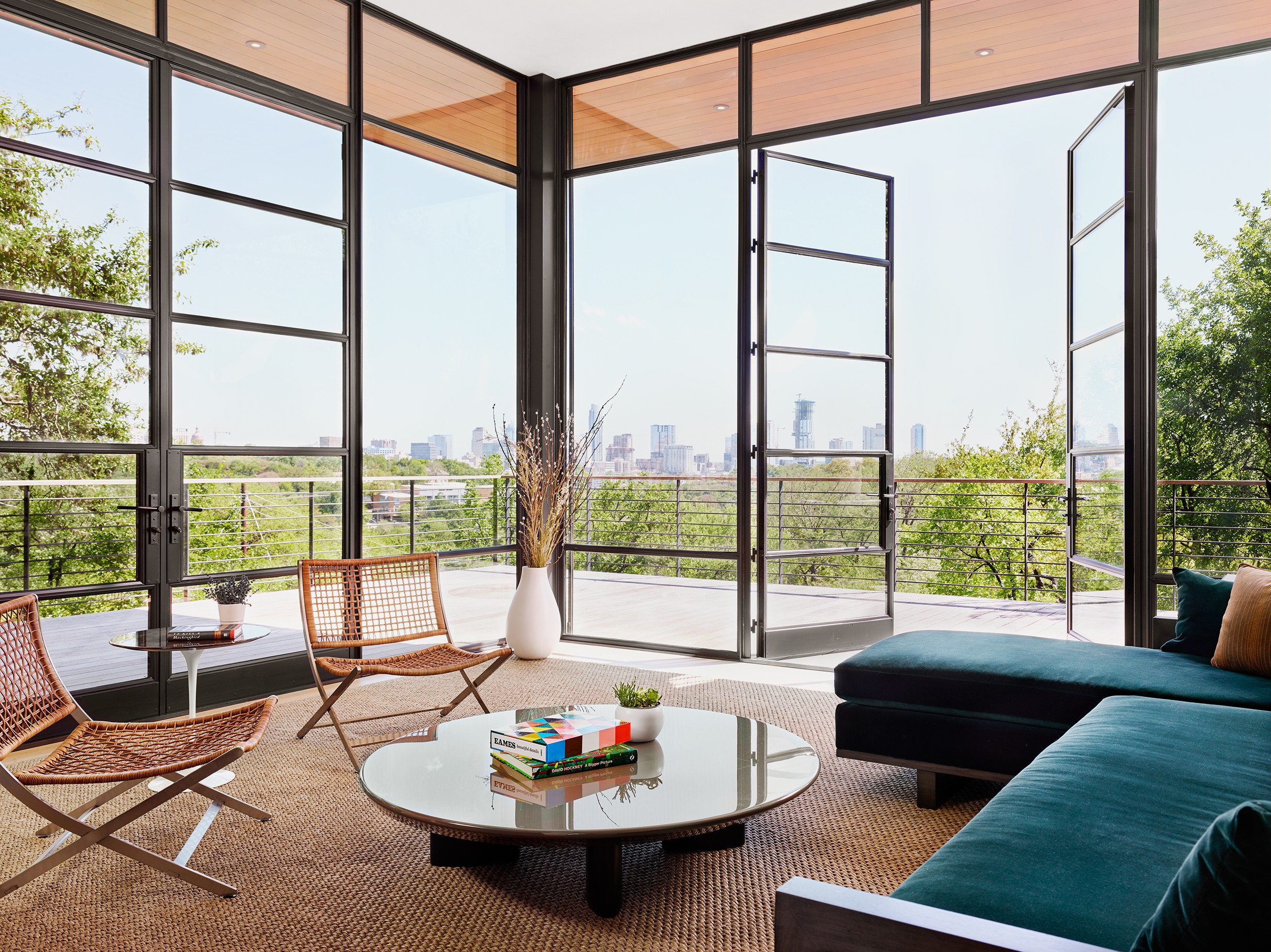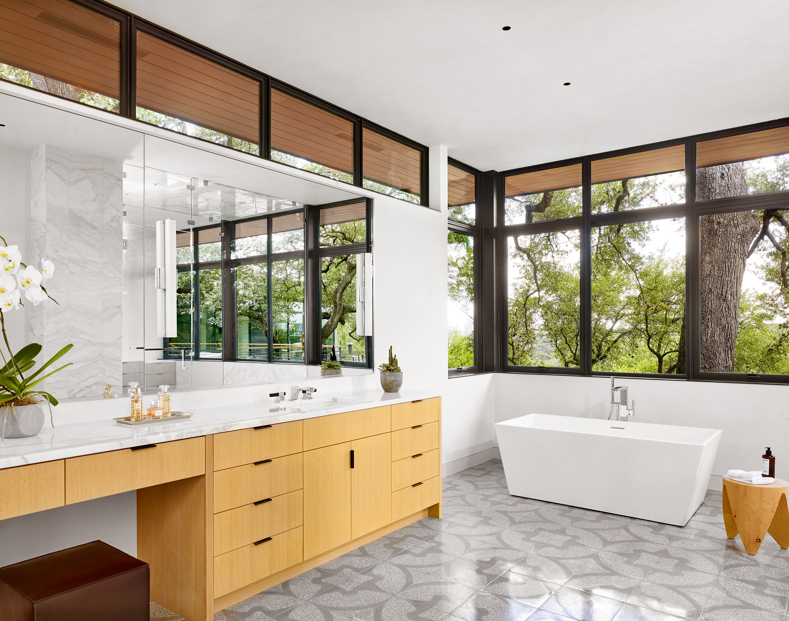 A significant commission early in MGD’s beginnings, the Pemberton Place residence showcases the highest standards in design and construction quality. The realizations of “what is possible” were made apparent on this project, working with the highest quality building artisans. Large heritage trees are highlighted, serving as natural anchors to the building and expansive exterior decks. Limestone is meticulously detailed and lives in perfect alignment with openings and material transitions. Wood siding provides warm accents and continuous wood ceilings run inside and out. Custom steel windows delicately frame expansive views of the site and downtown Austin beyond. Public spaces set up for grand entertaining while maintaining an intimate feel by use of warm materials and connections to the outside.