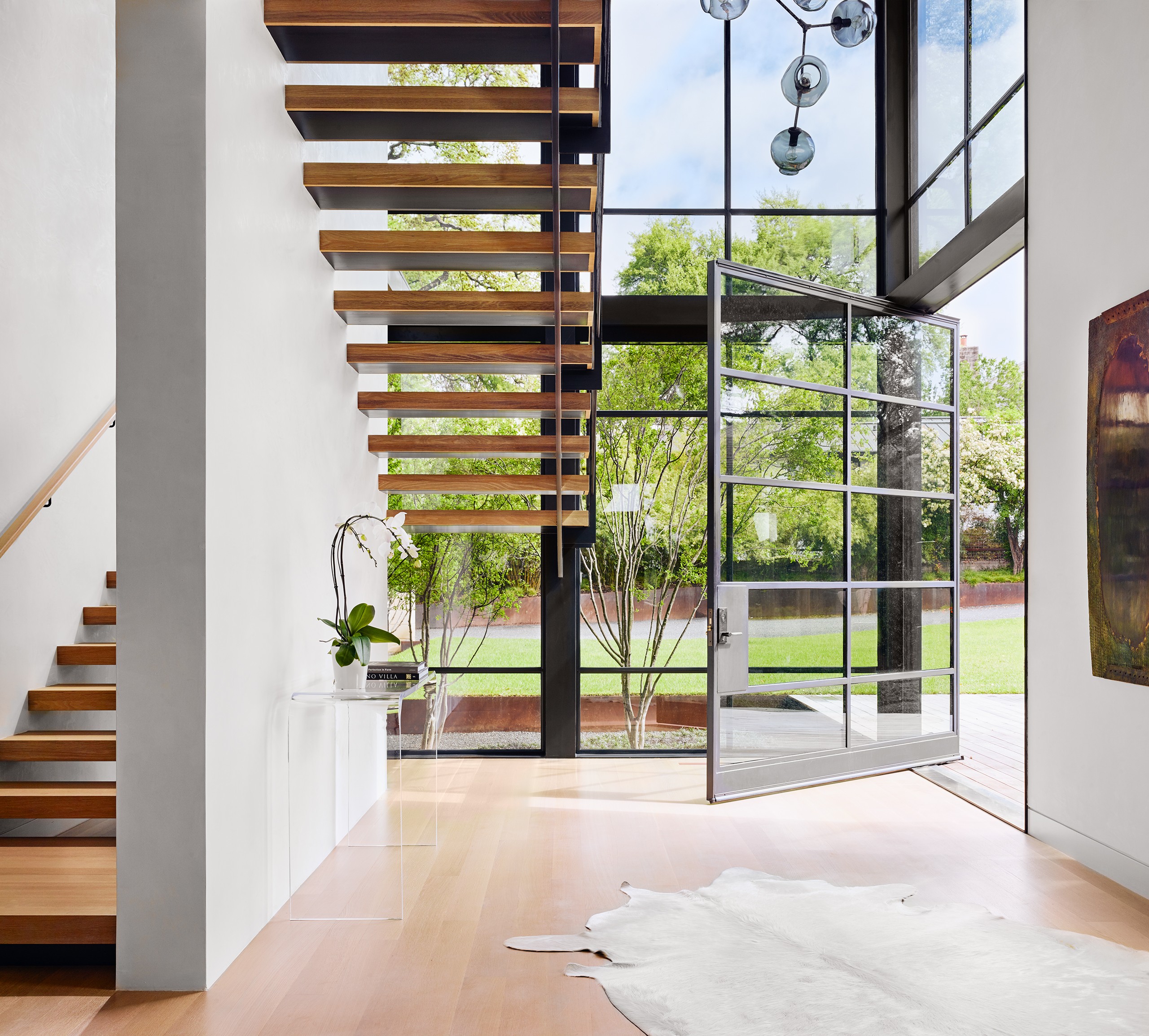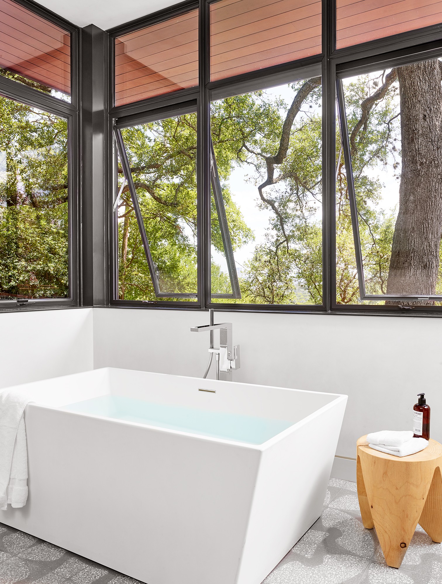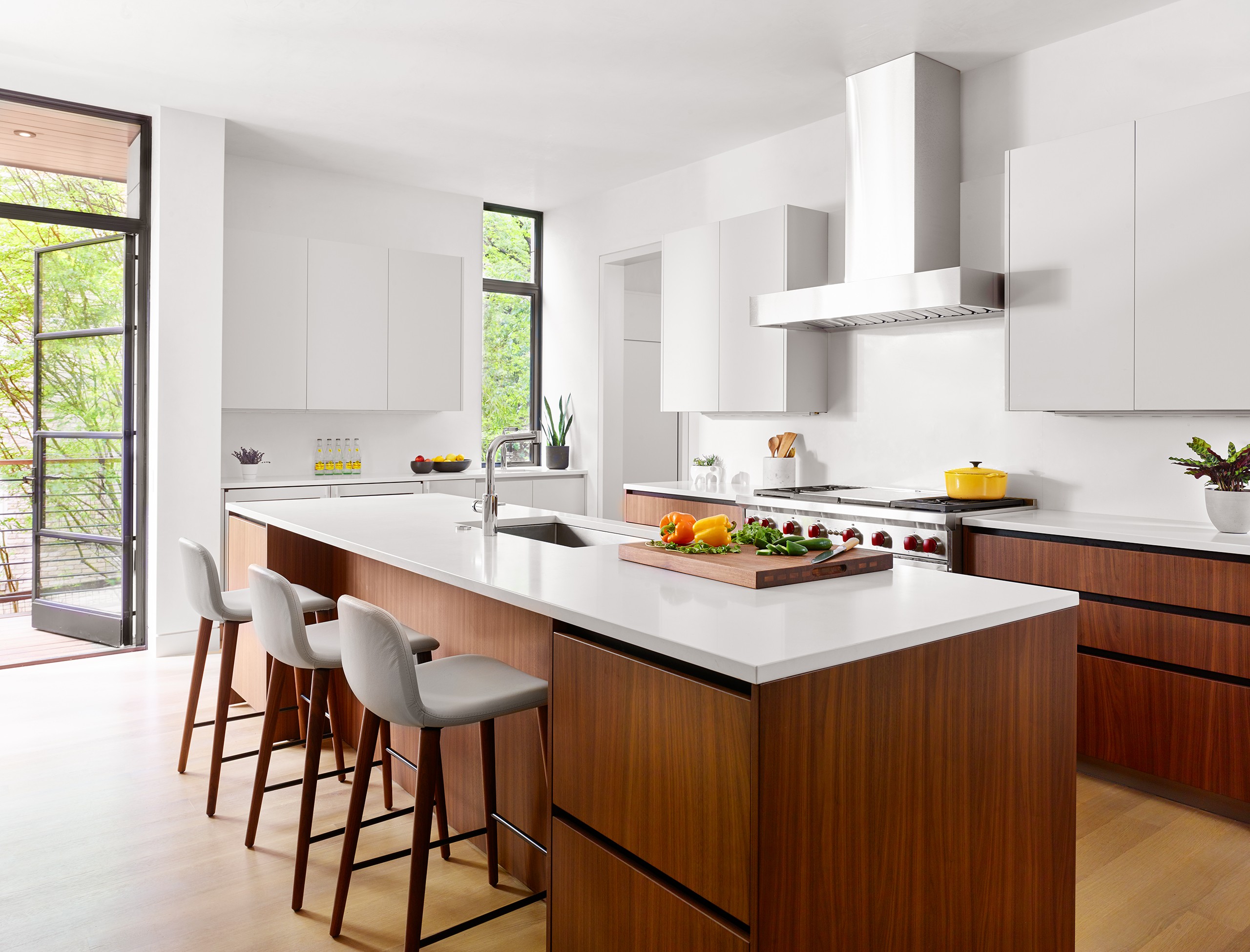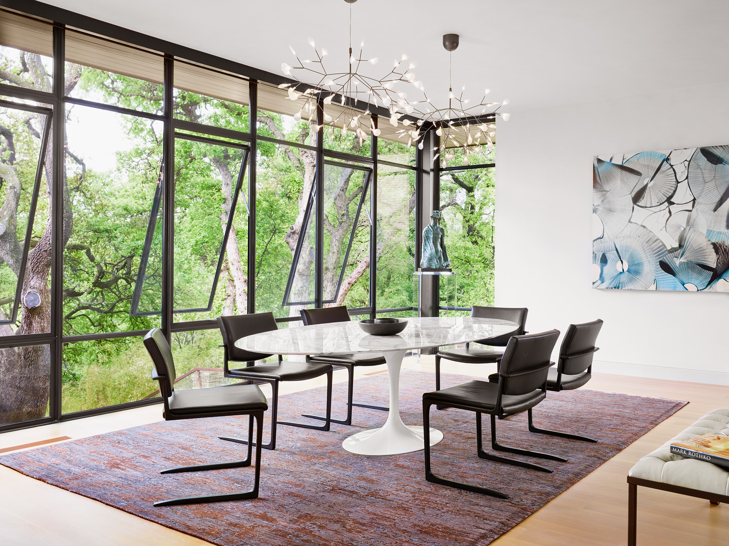 A significant commission early in MGD’s beginnings, the Pemberton Place residence showcases the highest standards in design and construction quality. The realizations of “what is possible” were made apparent on this project, working with the highest quality building artisans. Large heritage trees are highlighted, serving as natural anchors to the building and expansive exterior decks. Limestone is meticulously detailed and lives in perfect alignment with openings and material transitions. Wood siding provides warm accents and continuous wood ceilings run inside and out. Custom steel windows delicately frame expansive views of the site and downtown Austin beyond. Public spaces set up for grand entertaining while maintaining an intimate feel by use of warm materials and connections to the outside.