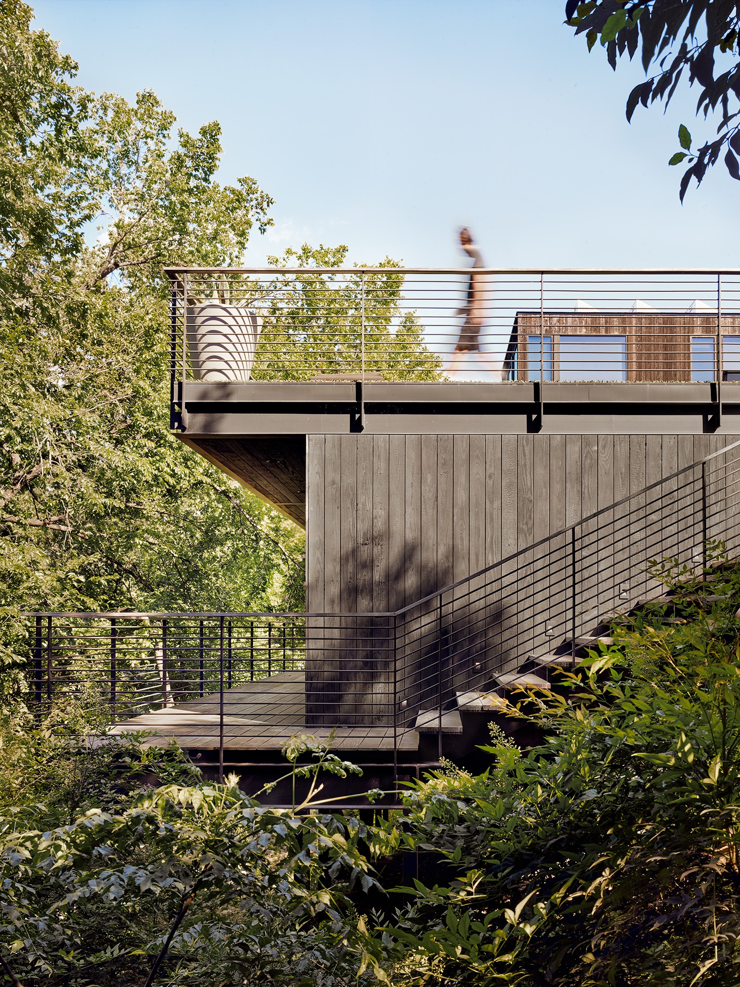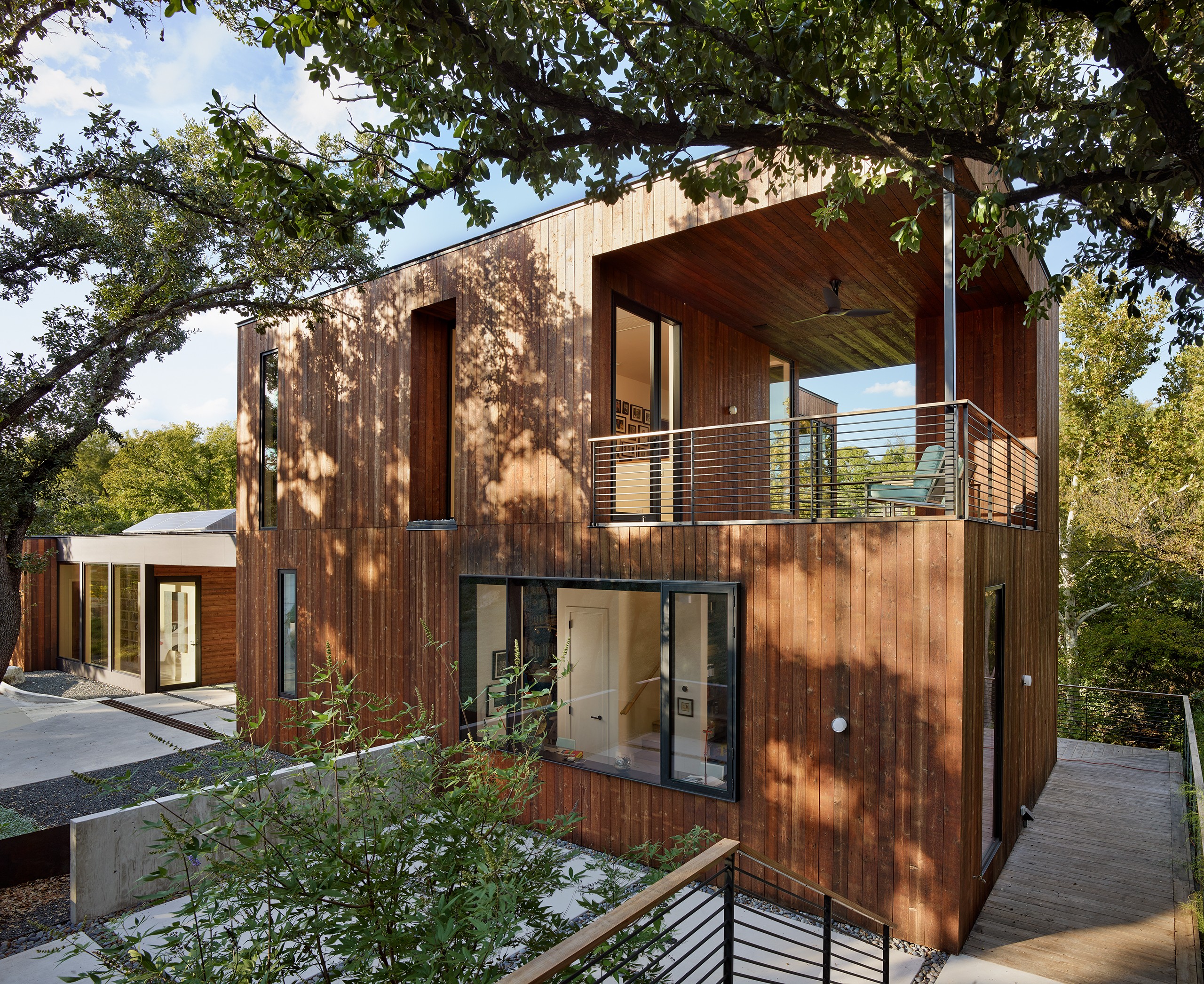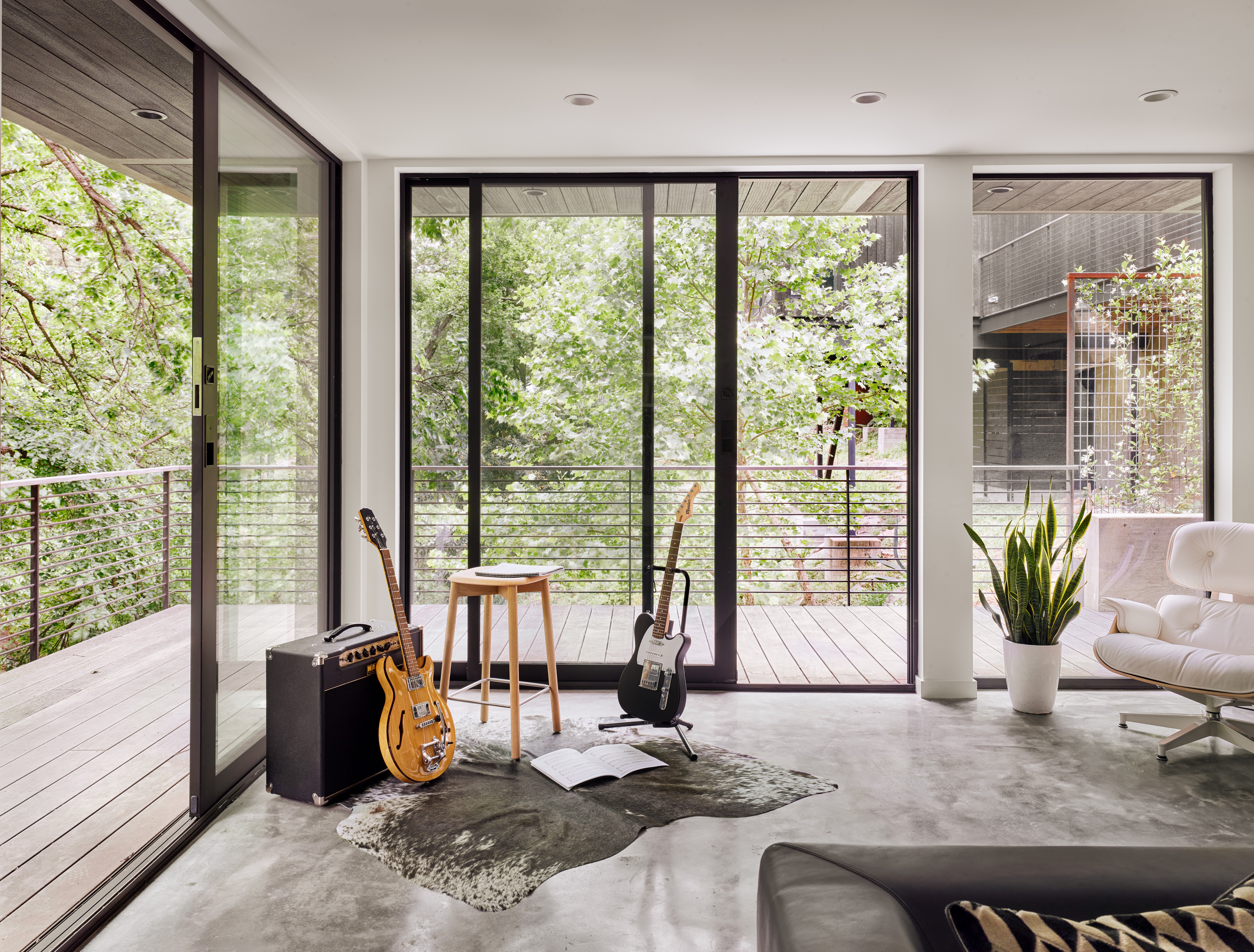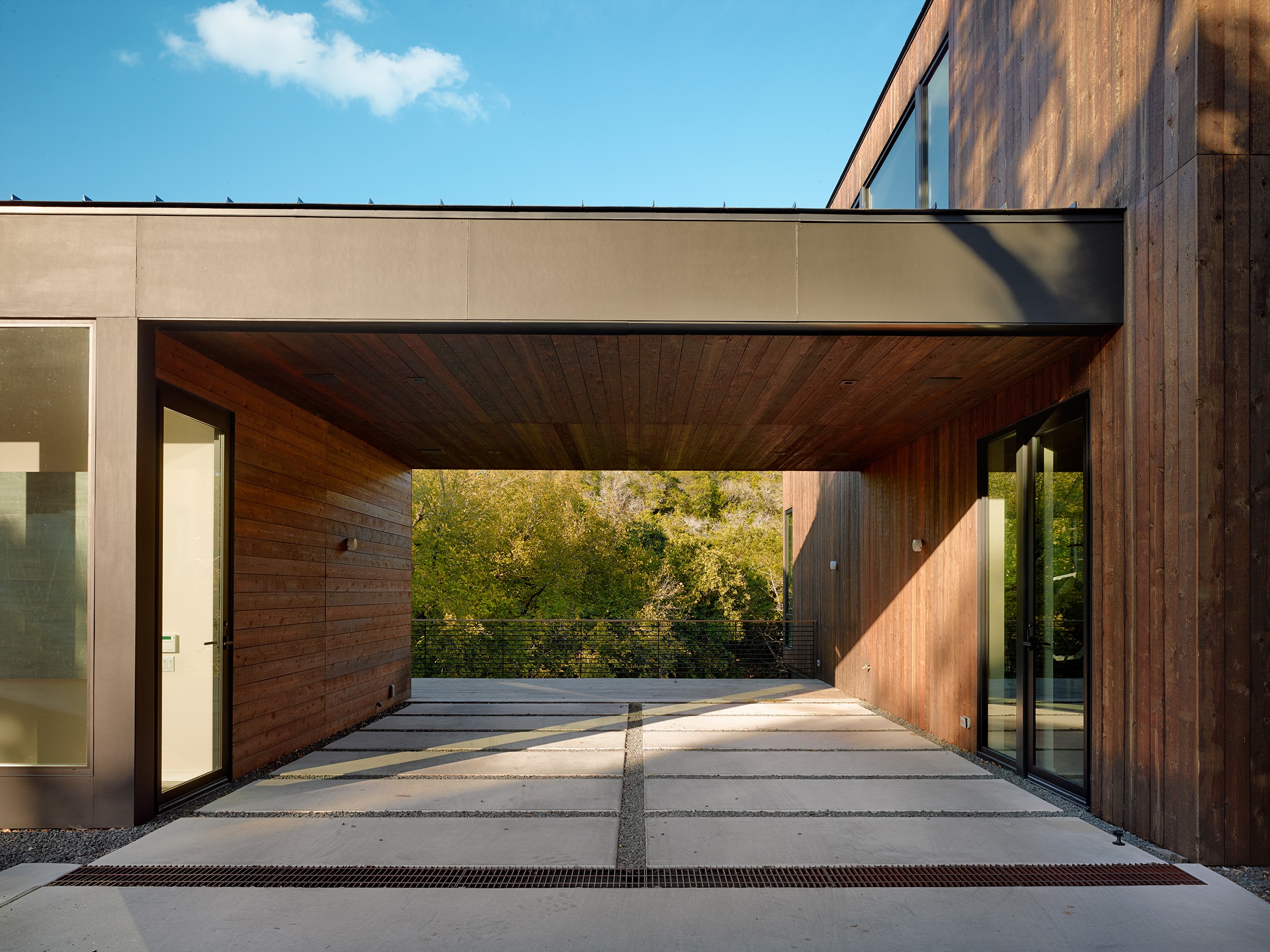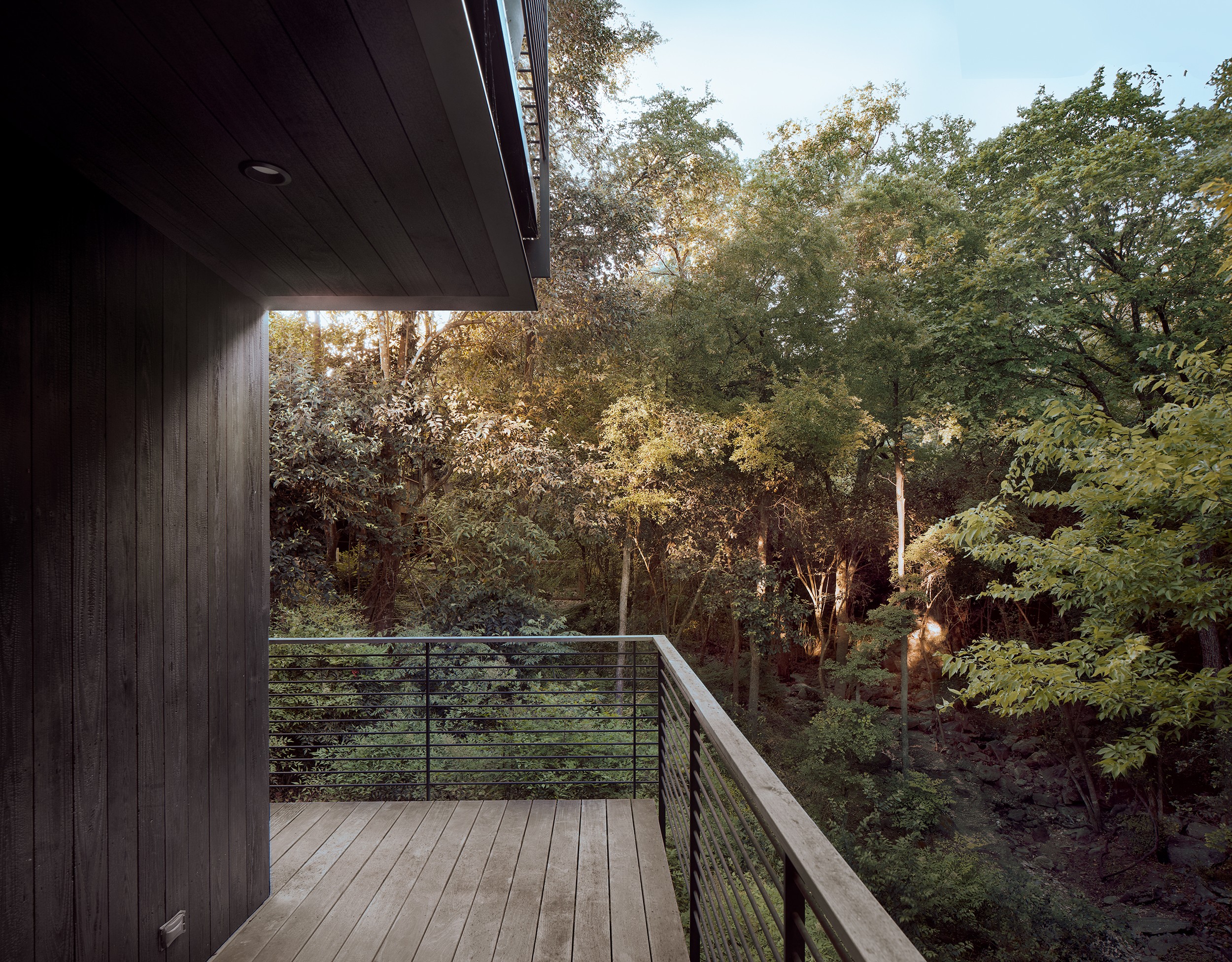 MGD’s first project that started the firm in 2011. A new build along with a small addition years later provide a tree house feel set within nature. Built on a lot deemed “too steep for construction”, the house is designed to float above and frame views of the creek below. Designed for just turned empty nesters, the project features a main house for daily living and a separate guest house for visiting family and guests. The two buildings are connected by a carport. The guest building can be “turned off” while not in use saving energy. The multi-purpose addition below becomes a surprise destination and puts one further into the creek. A completely private outdoor shower caps off the living in nature experience.