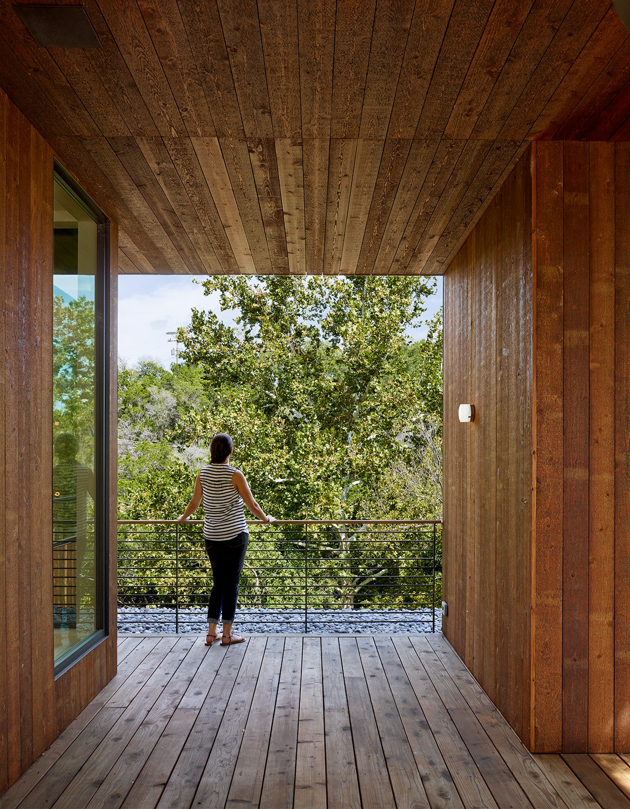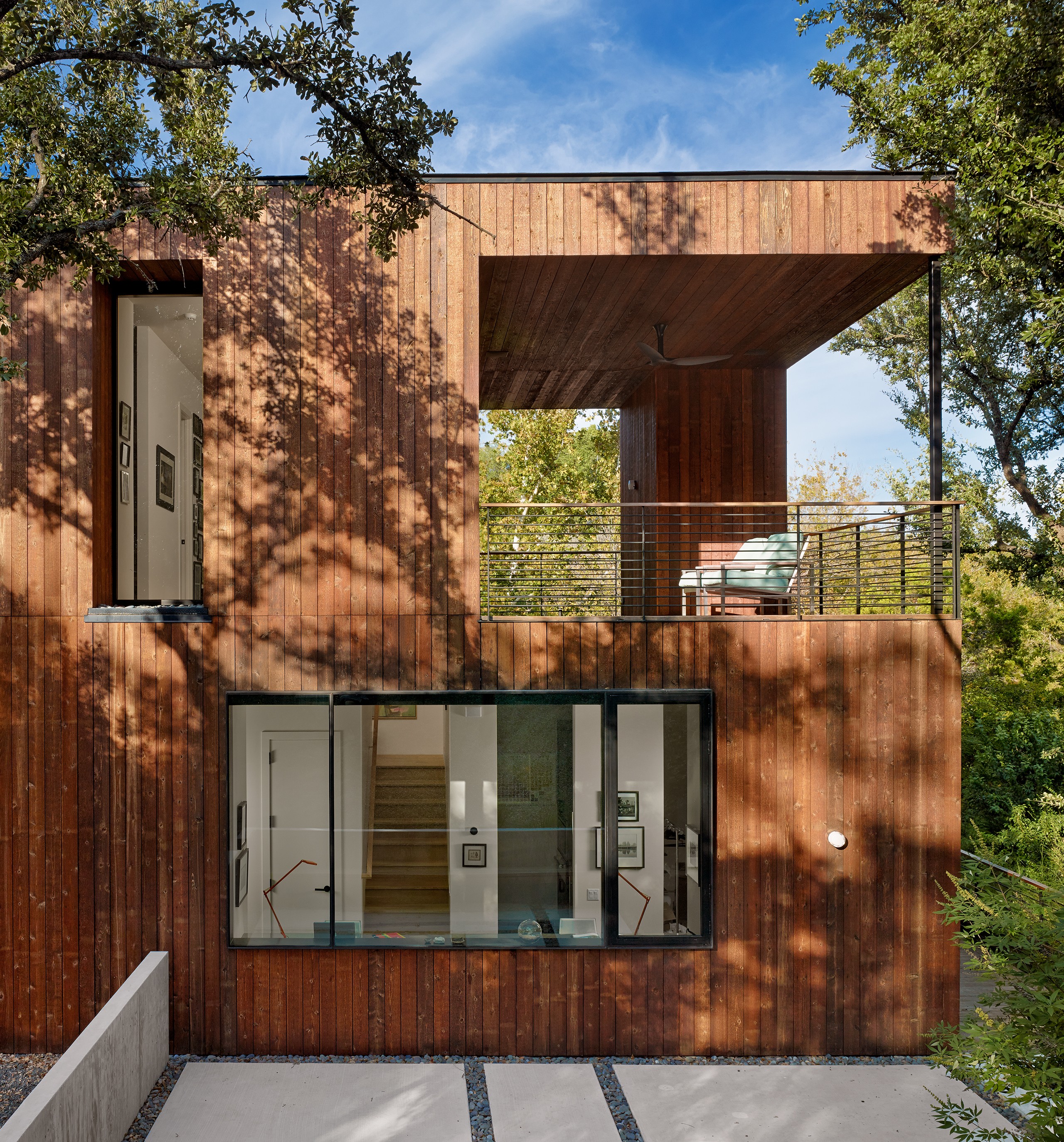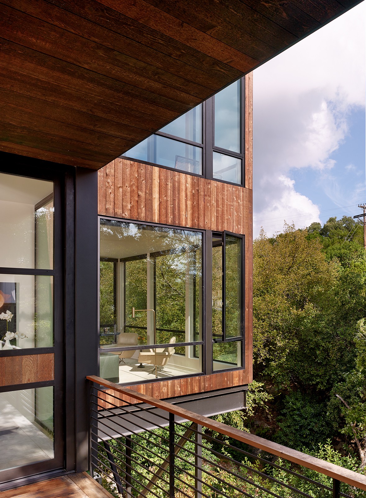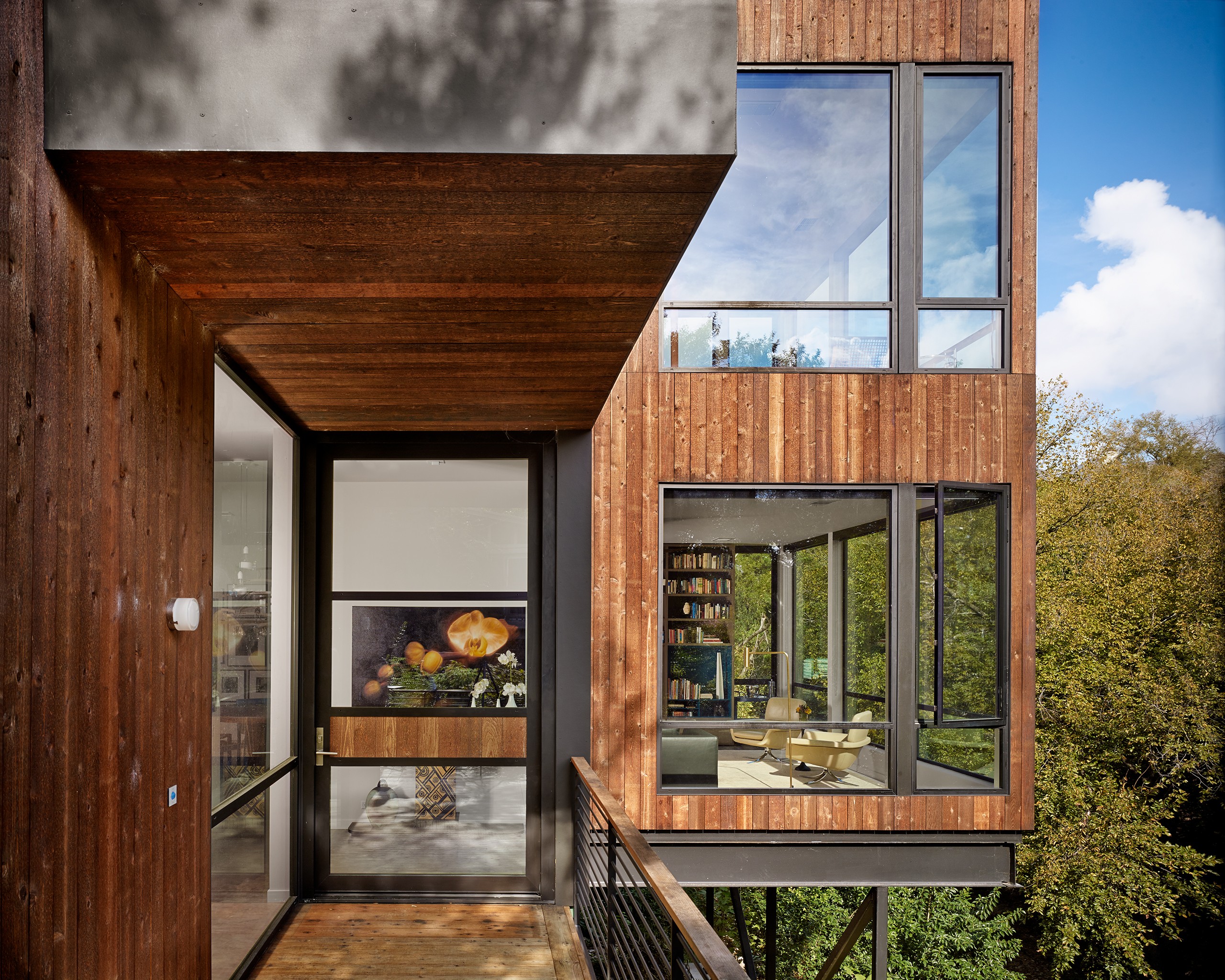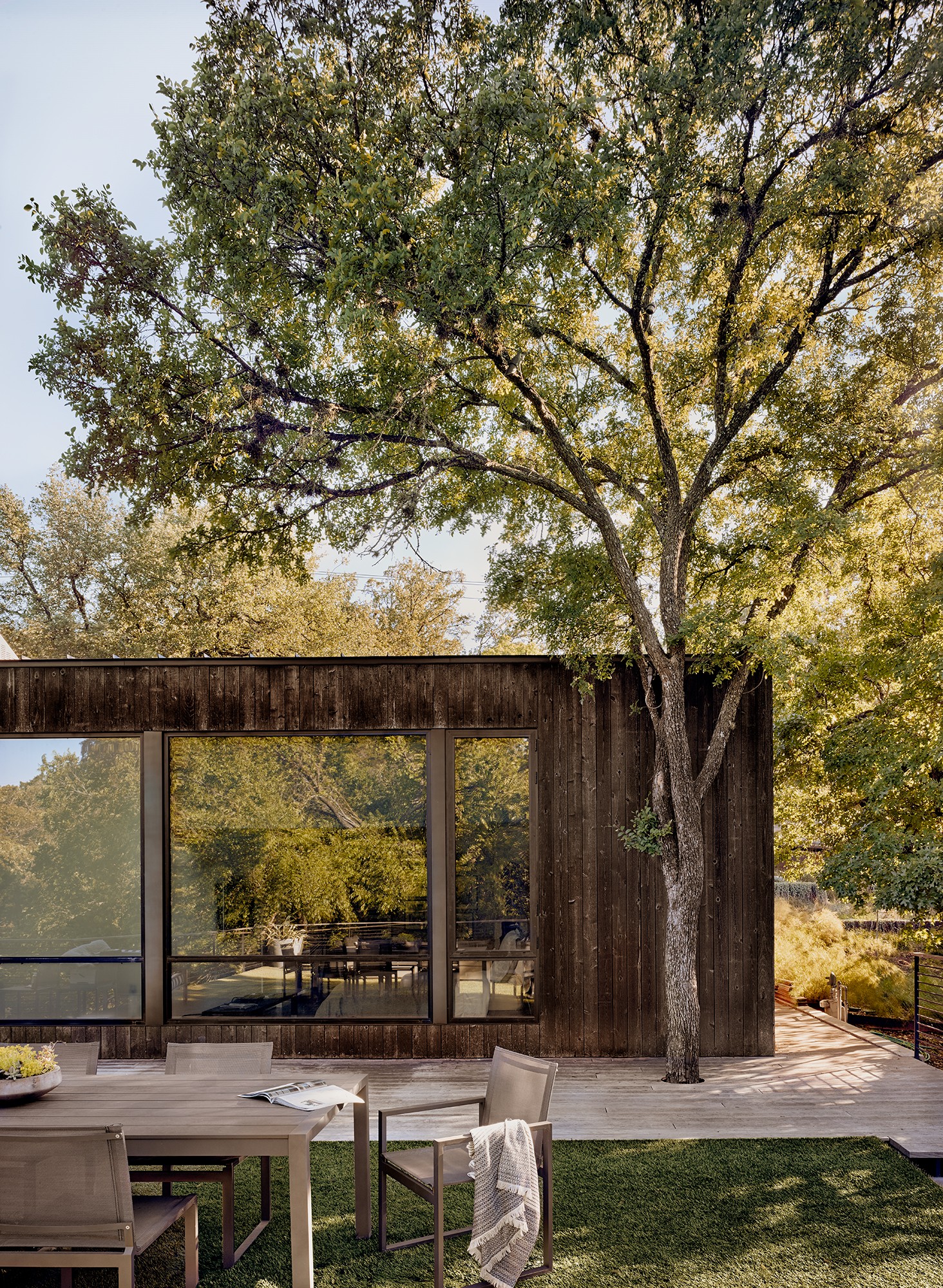 MGD’s first project that started the firm in 2011. A new build along with a small addition years later provide a tree house feel set within nature. Built on a lot deemed “too steep for construction”, the house is designed to float above and frame views of the creek below. Designed for just turned empty nesters, the project features a main house for daily living and a separate guest house for visiting family and guests. The two buildings are connected by a carport. The guest building can be “turned off” while not in use saving energy. The multi-purpose addition below becomes a surprise destination and puts one further into the creek. A completely private outdoor shower caps off the living in nature experience.