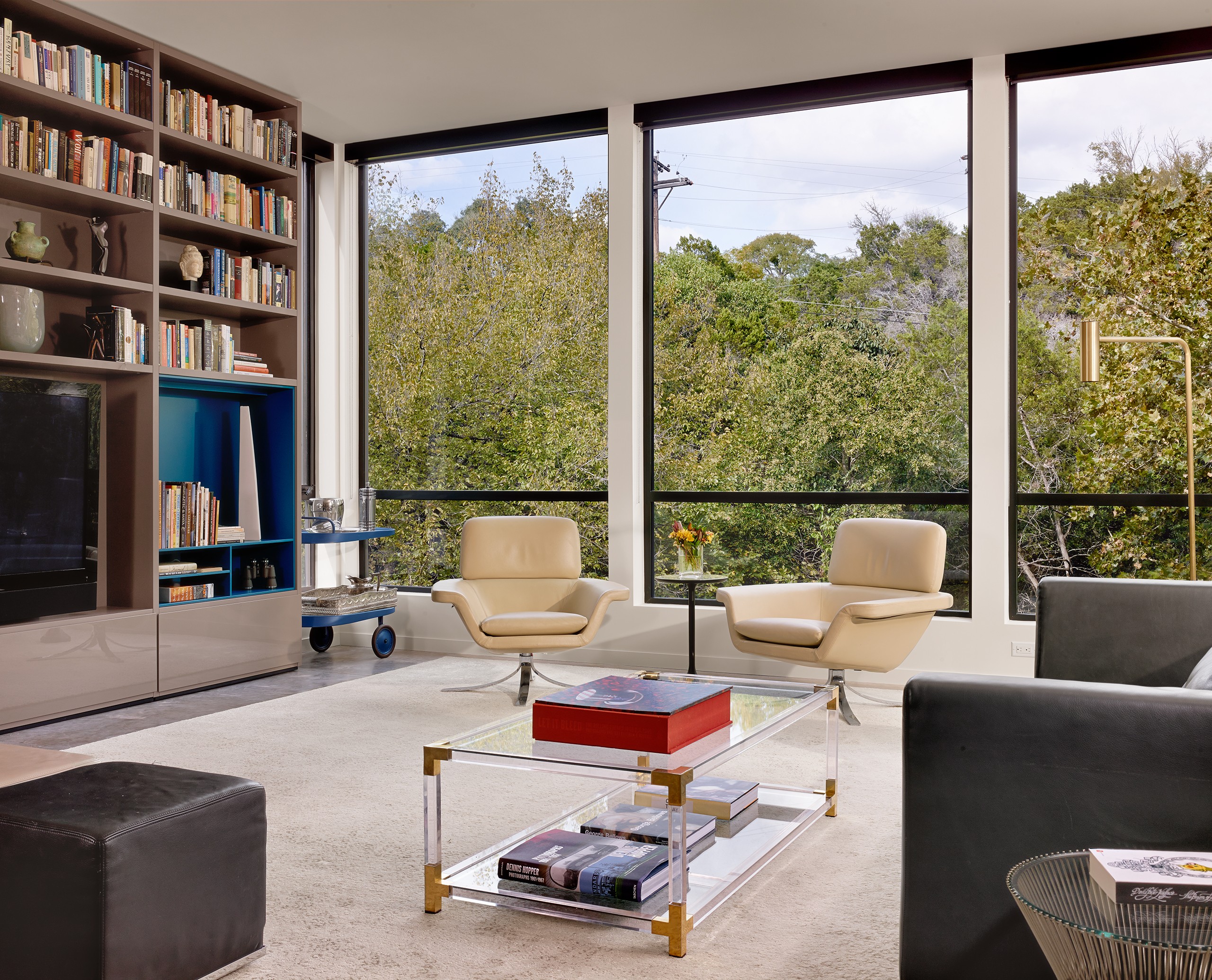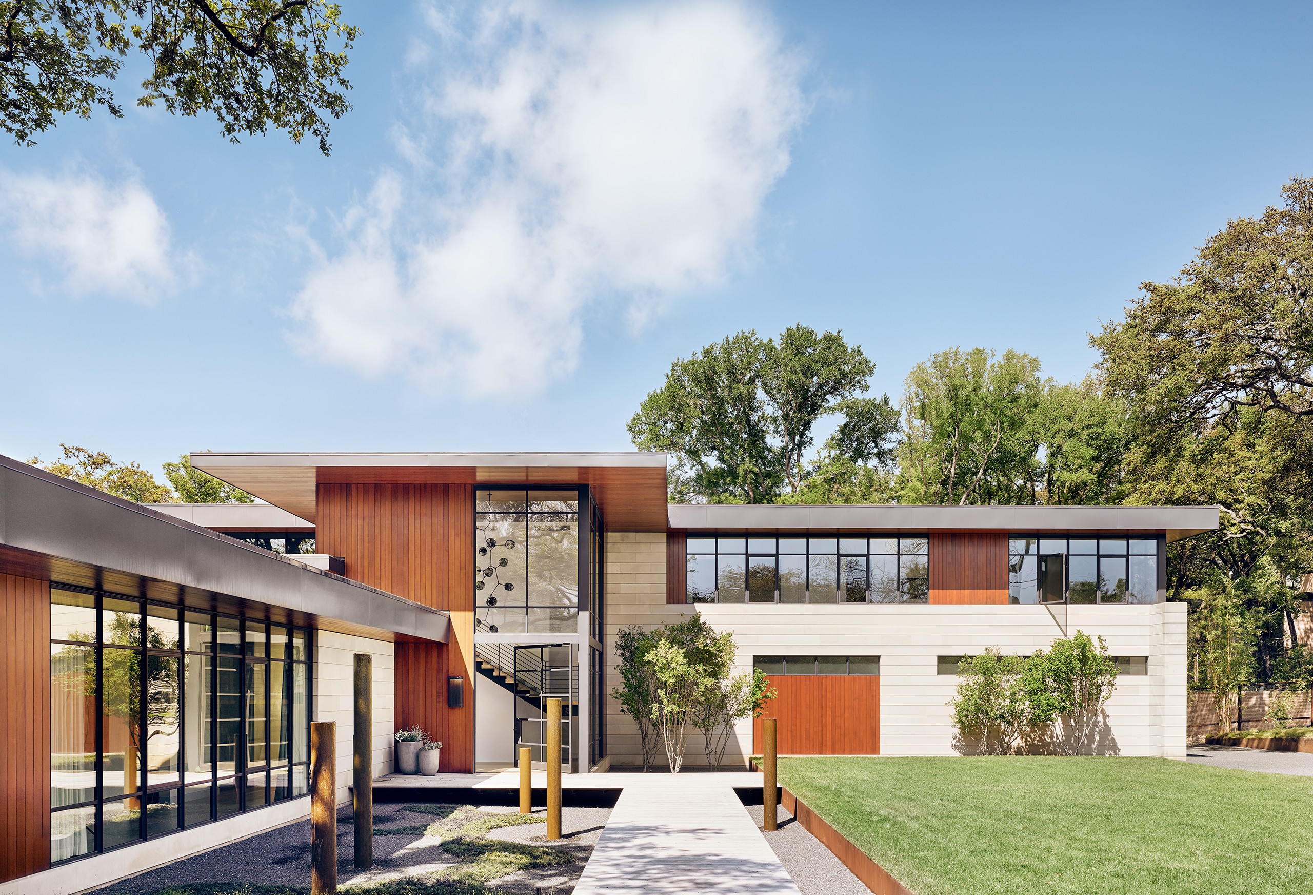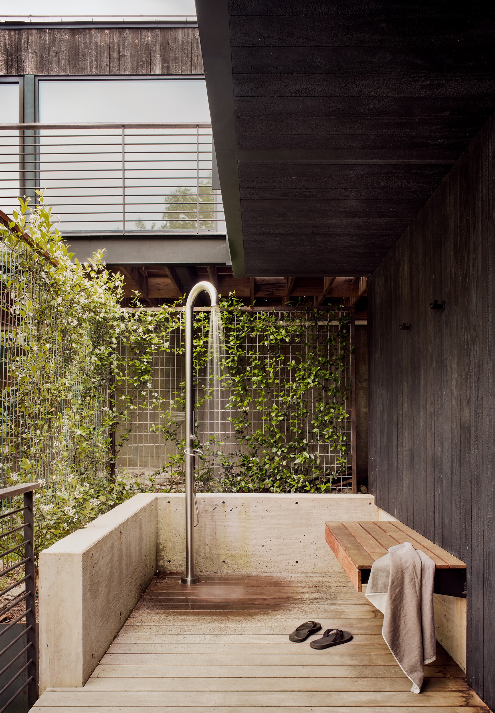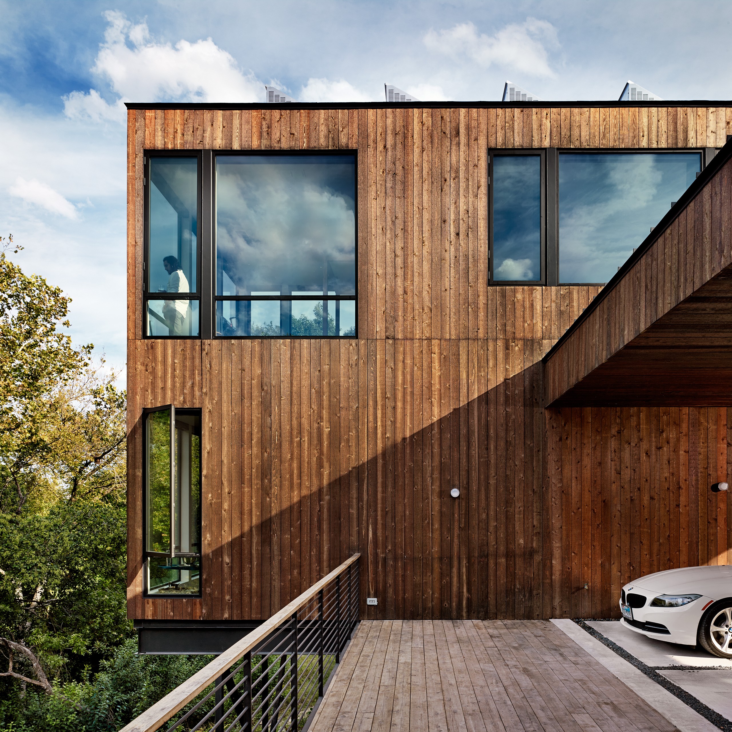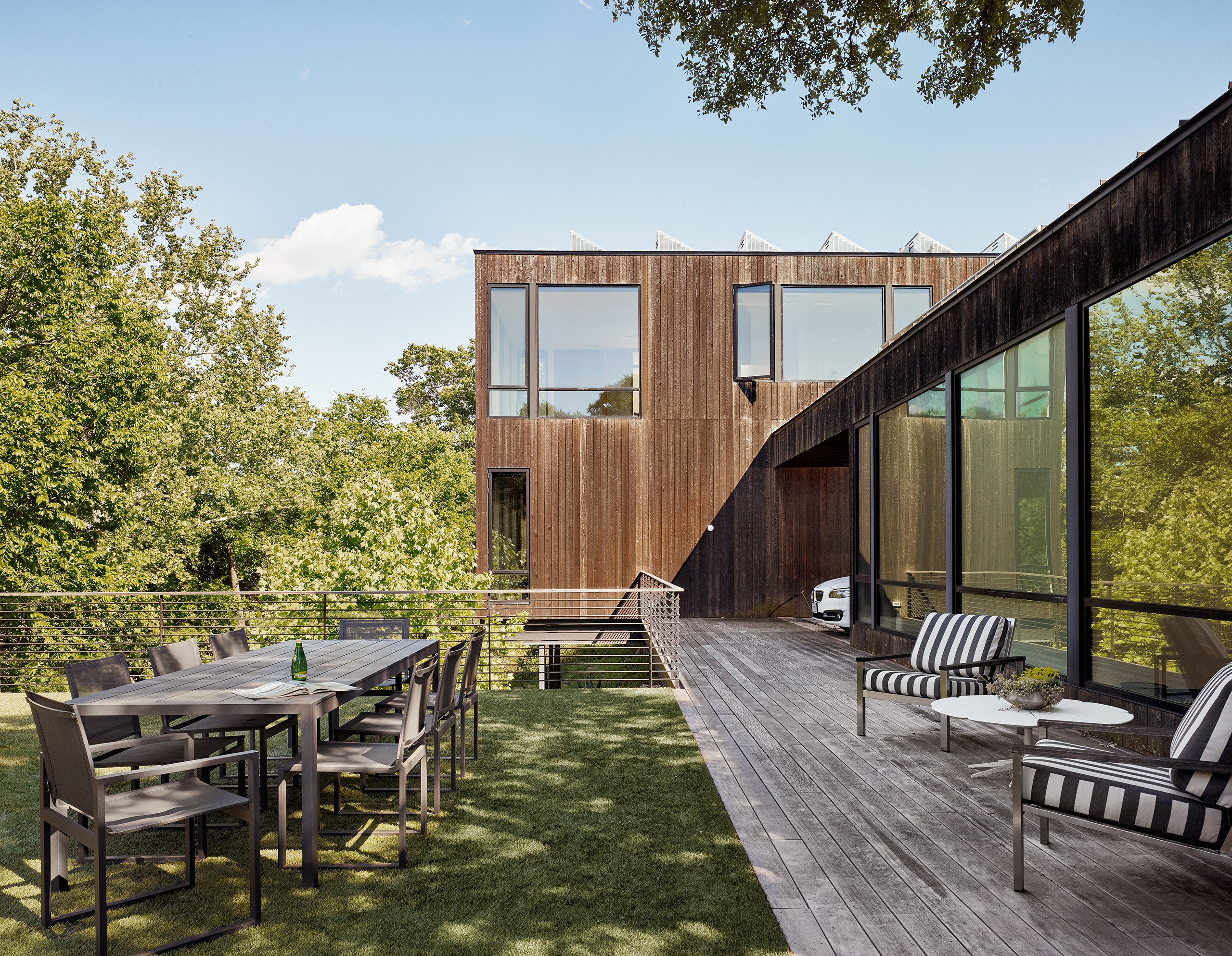 MGD’s first project that started the firm in 2011. A new build along with a small addition years later provide a tree house feel set within nature. Built on a lot deemed “too steep for construction”, the house is designed to float above and frame views of the creek below. Designed for just turned empty nesters, the project features a main house for daily living and a separate guest house for visiting family and guests. The two buildings are connected by a carport. The guest building can be “turned off” while not in use saving energy. The multi-purpose addition below becomes a surprise destination and puts one further into the creek. A completely private outdoor shower caps off the living in nature experience.